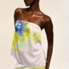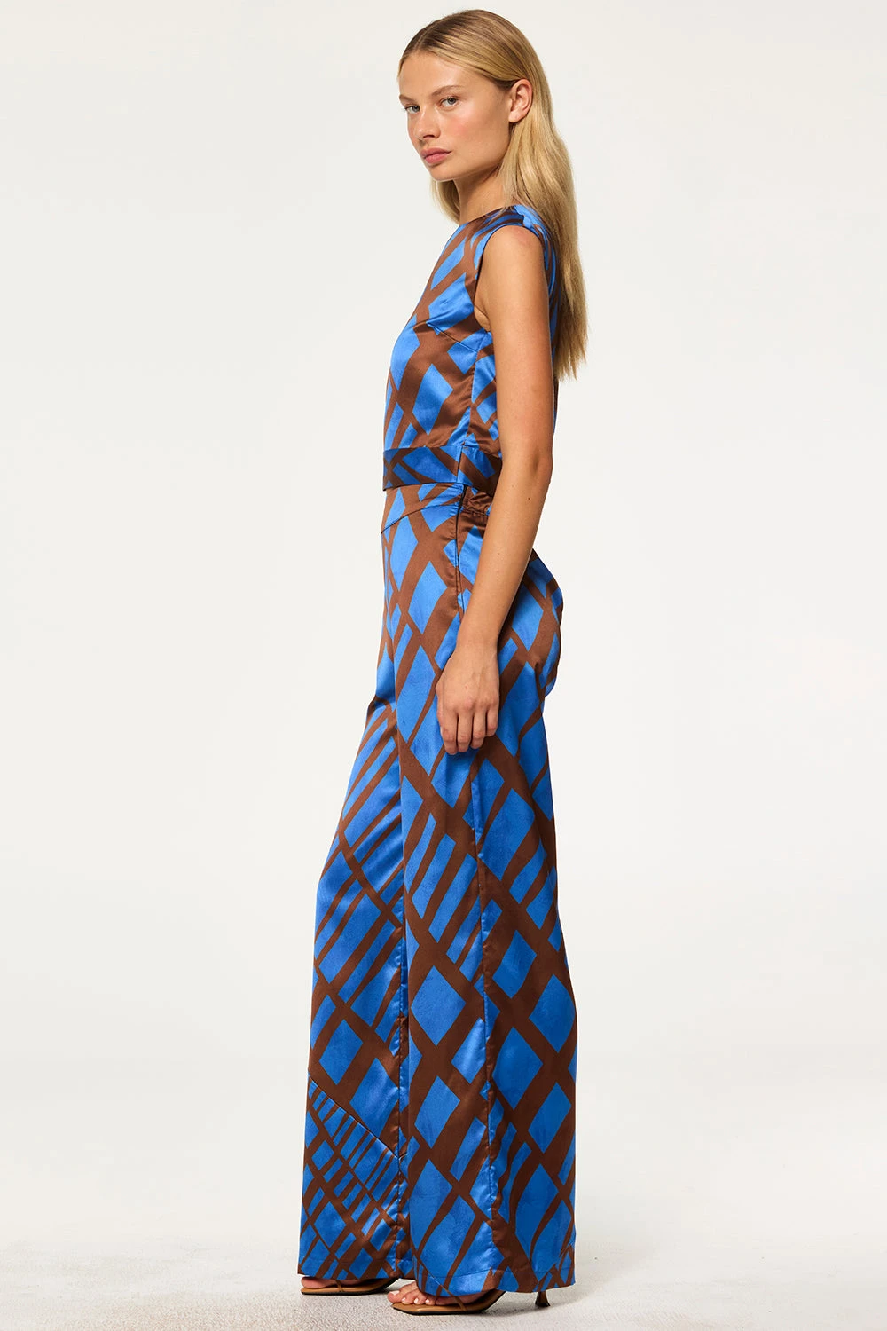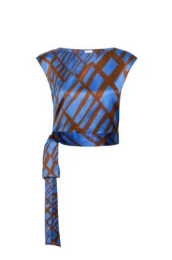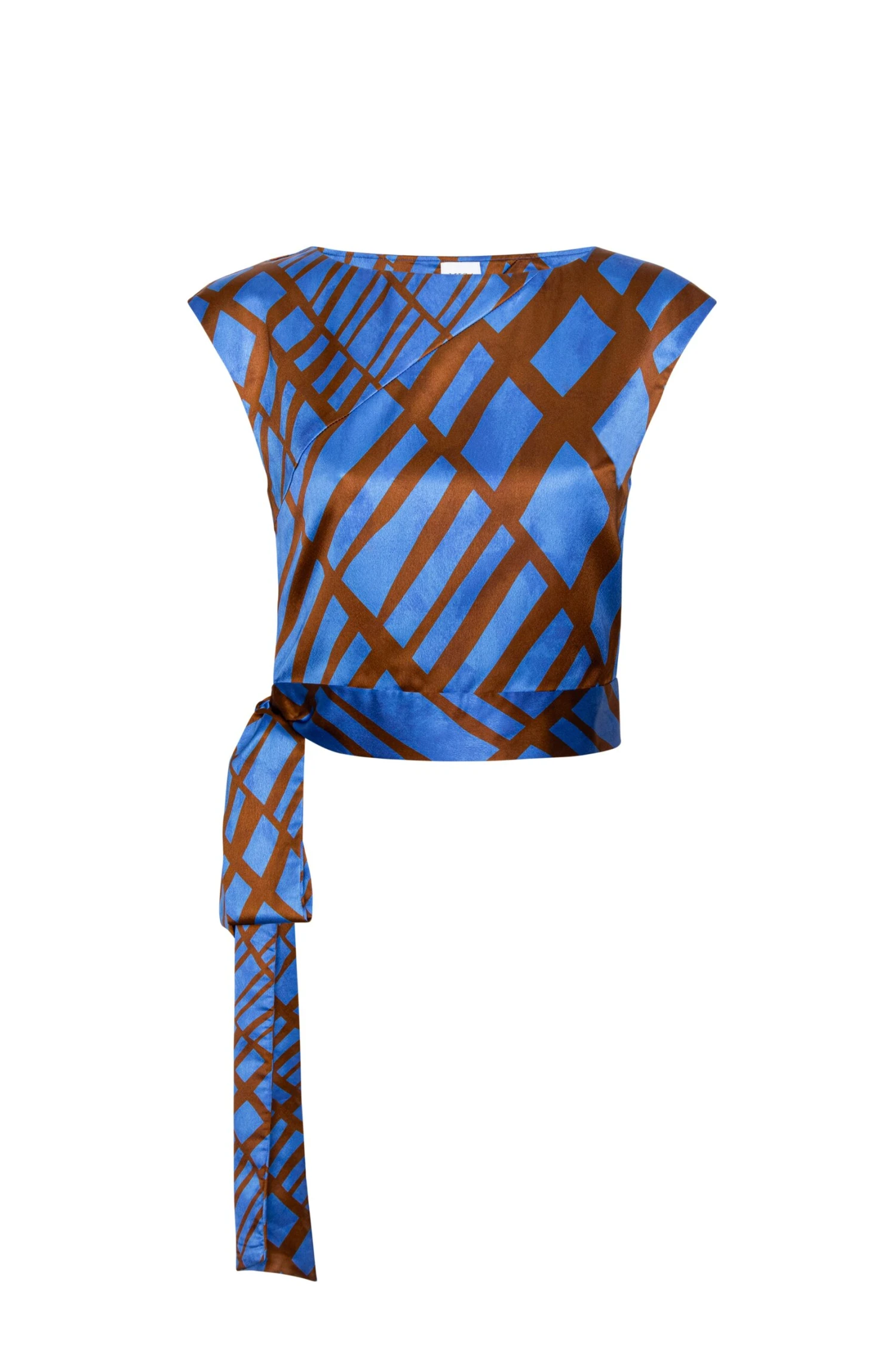 Abbi is a chic sleeveless top with a flattering boatneck cut, crafted from a vibrant blue and brown Matrix-printed satin that plays with pattern and scale. Its cropped silhouette is perfectly fitted and finished with a built-in side tie belt for an effortlessly cinched waist. Pair it with the coordinating Ilana pant for a striking head-to-toe look.