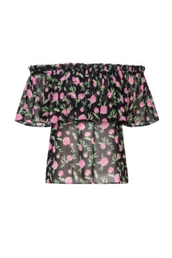 Adah is an easy off-the-shoulder silhouette cut from our lovely Pink Peony print on black ground. A wide ruffle across the chest with a double lined loose body. Pair with the coordinating Polly skirt or with your favorite pair of jeans.