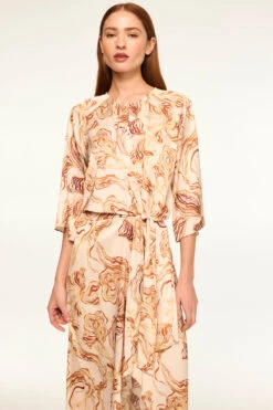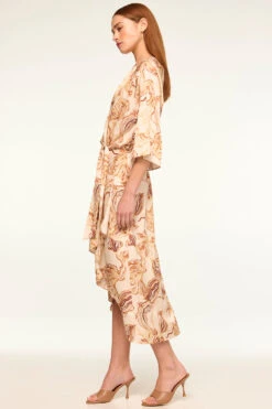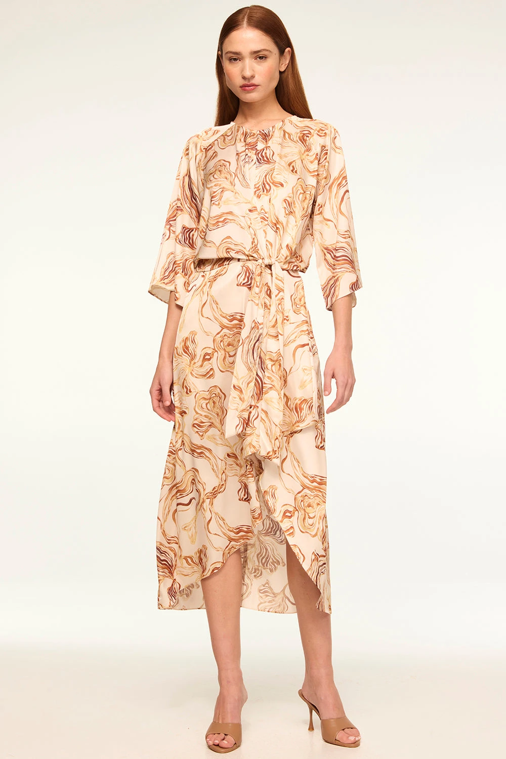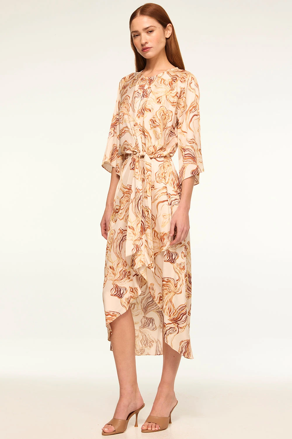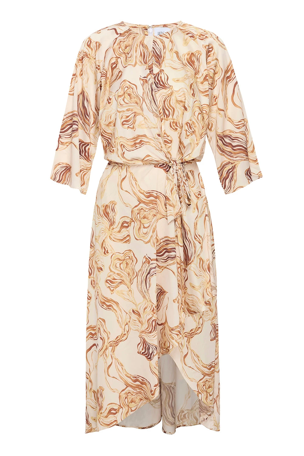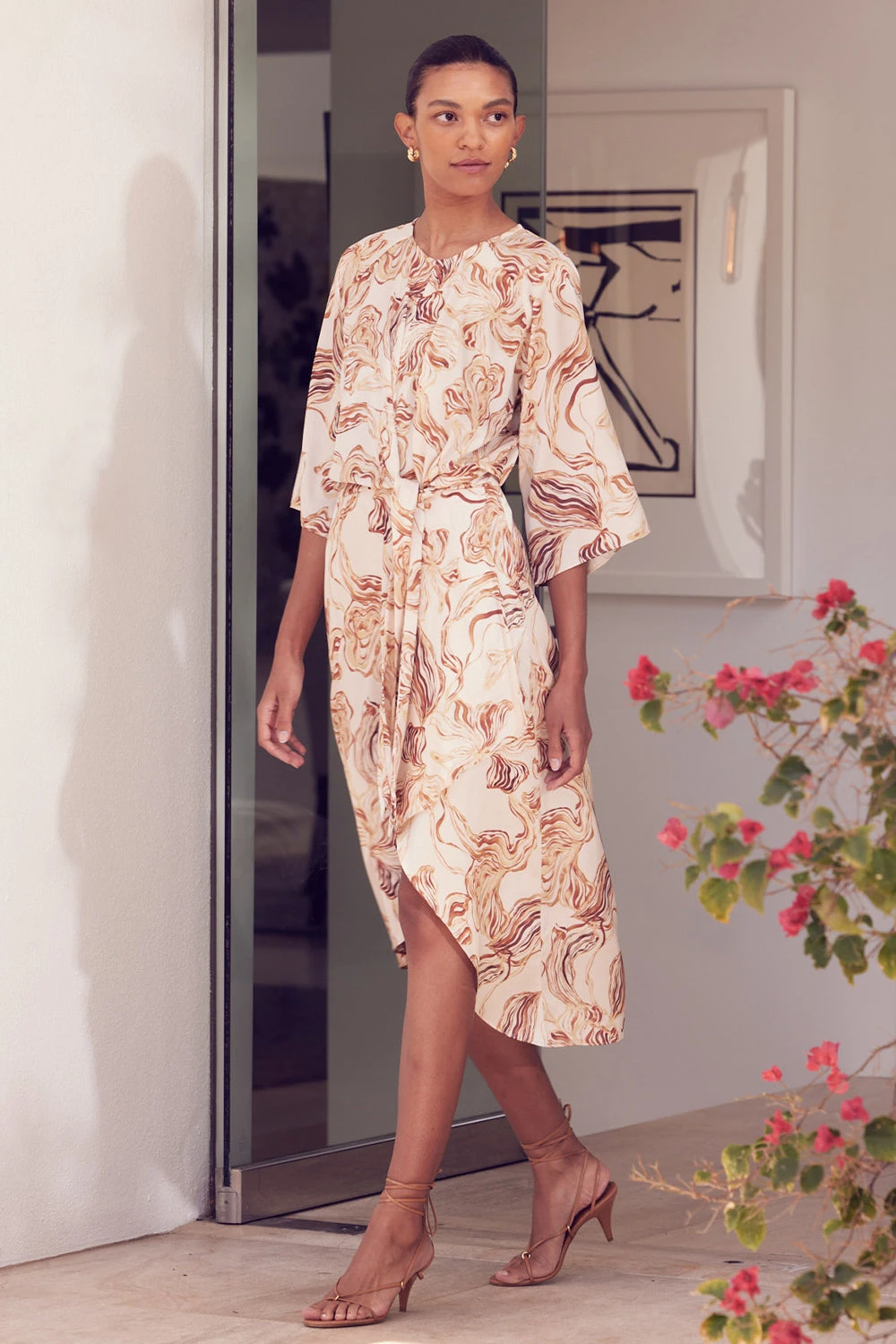 Our new Adina dress is a chic midi silhouette with three-quarter sleeves and a rounded neckline. Featuring a self-tie front that leads into a flattering faux wrap tulip skirt. Cut from our Golden Straw print satin, this style is the perfect desk to dinner look.