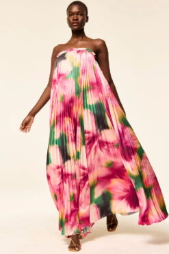 Be the best dressed guest in our stunning Agatha maxi dress. Cut from a gorgeous pleated satin in our Blurred Hibiscus print, this strapless style is made for movement. Pull-on style with an elasticated band across the bust finished with a ruffle detail.