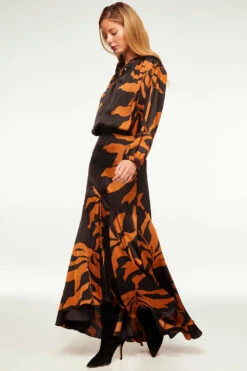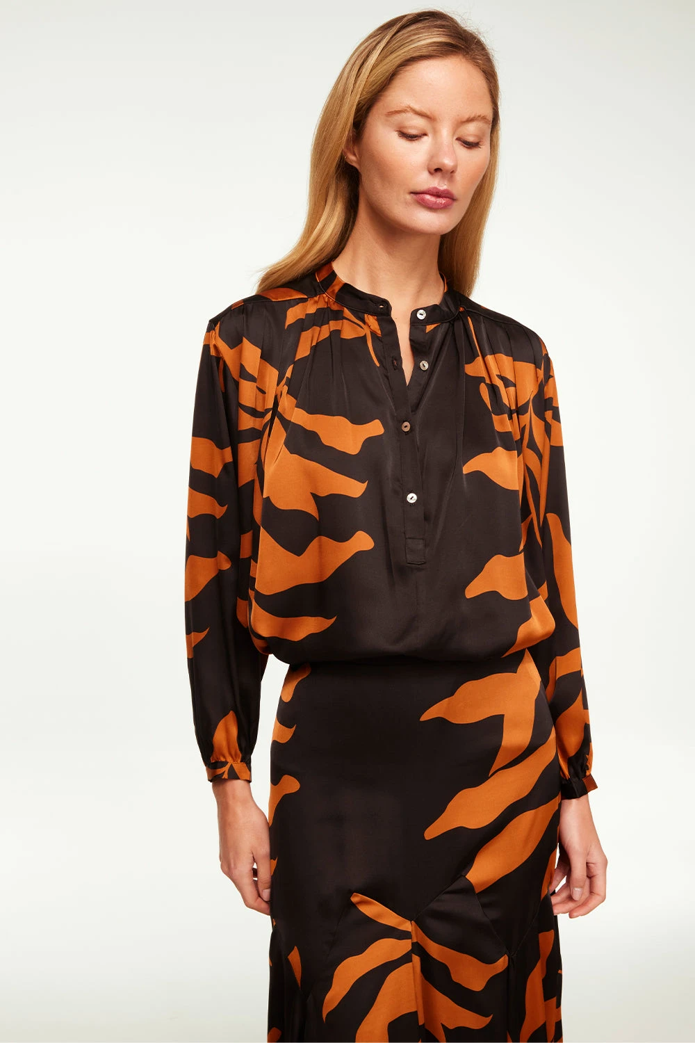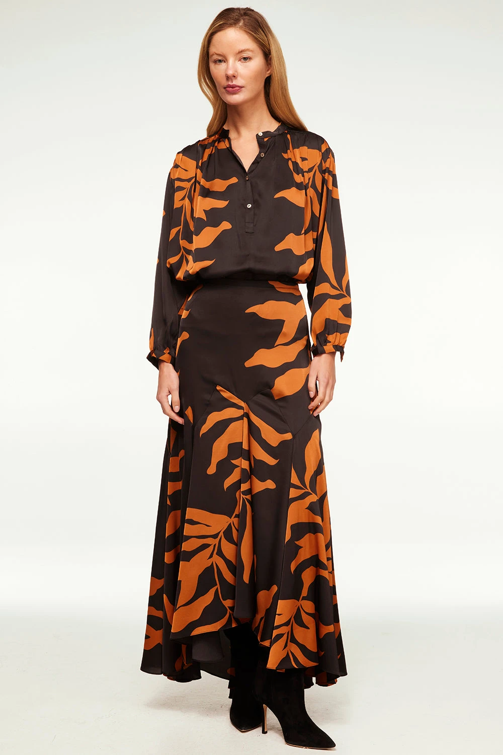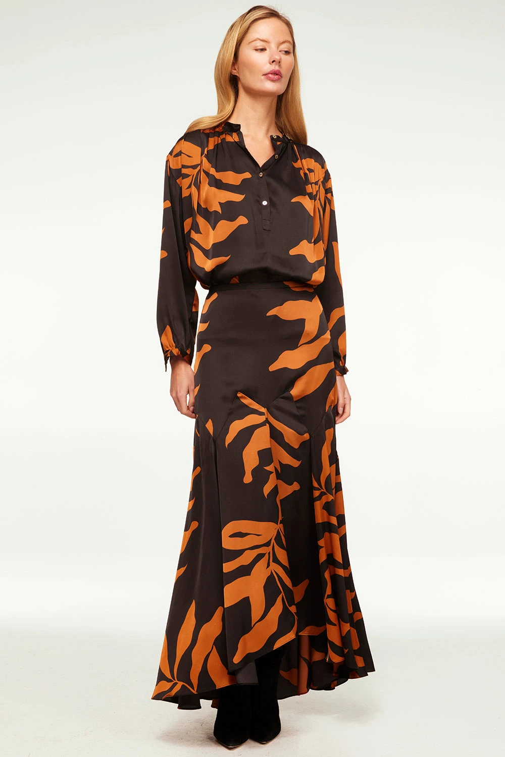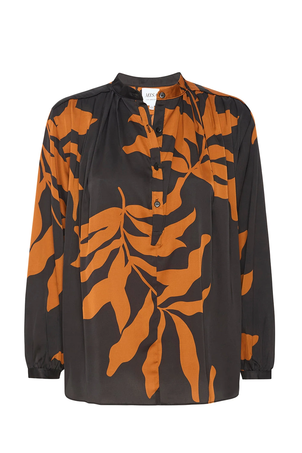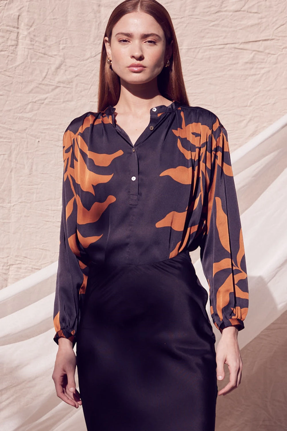 Our new Allyn top is a long sleeve blouse cut from a black satin and caramel fern print. A half summary placket gathered at the shoulders with pearlized summarys and long sleeves with summary cuffs. Pair this easy style with your favorite wide leg pants or the coordinating Shelley skirt.