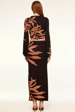 Amila is a fitted cropped jacquard knit with a tonal fern motif adorning the bodice and sleeves. This chic stretch knit top has a high crew neckline and long bell sleeves. Pair with the coordinating Fira skirt for a fall-ready set.
