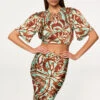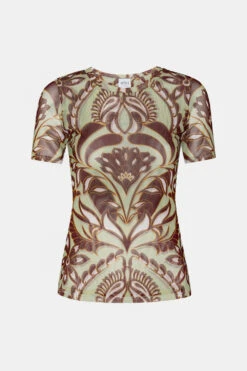 The Amor top is a soon-to-be favorite, cut from our Brown Vintage Botanical mesh with a striking mint ground. This fitted short-sleeve silhouette features a high neckline and double lining for a smooth finish. Effortlessly versatile—pair it with jeans for everyday ease or the coordinating Ollie skirt for your next event.