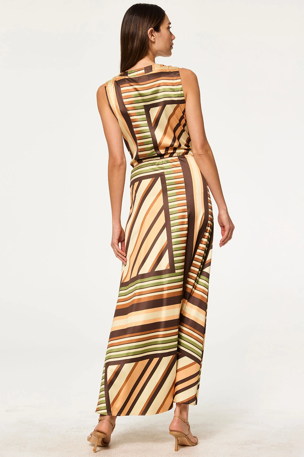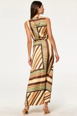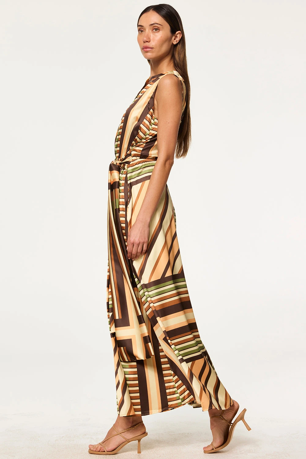 The Anabella dress, a best-selling favorite, returns for summer in our chic Geo Scarf–printed satin. This event-ready maxi features a sleeveless bodice with a contrast summary placket, a wide self-tie belt over a flattering elastic waist, and a thigh-high slit for added movement and allure. Perfect for special occasions this season and beyond.