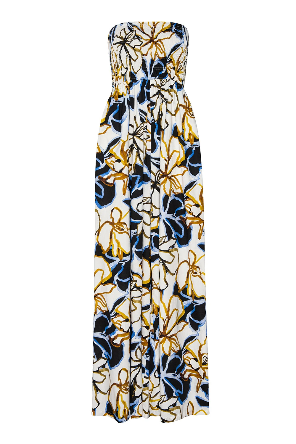 Our best-selling Andrea jumpsuit is back in a Bold Blooms printed cotton. This strapless wide-leg style features a flattering smocked bodice and side slit pockets. Pair with sandals or dress up with heels.