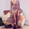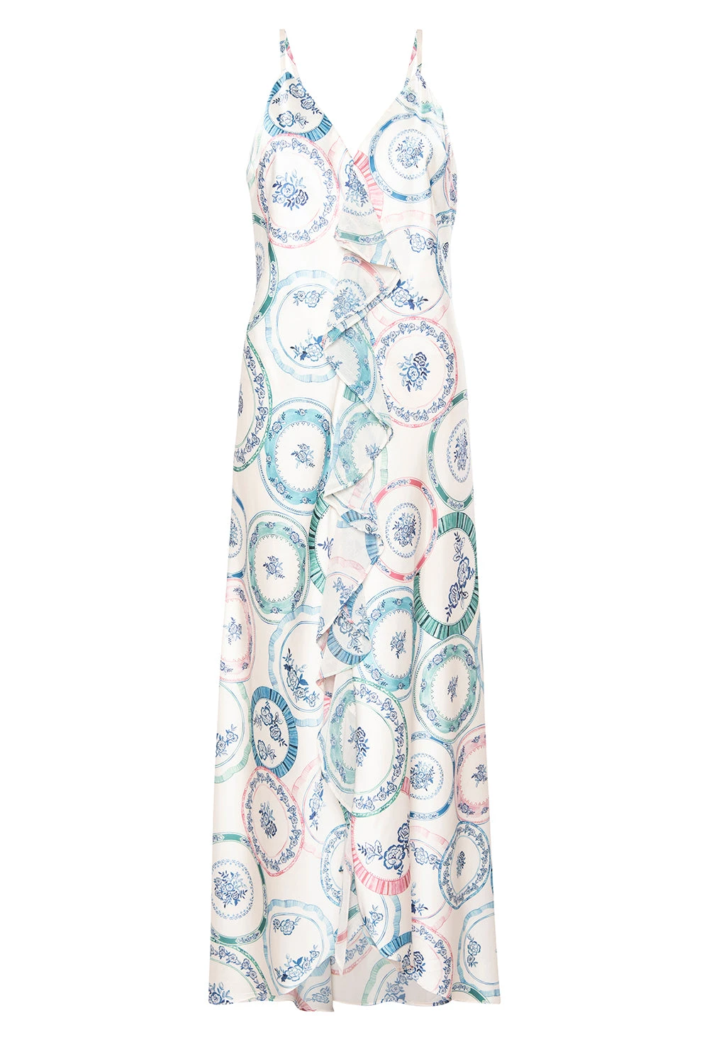 Angela is an ankle-grazing maxi slip cut from our silky Prismatic Plates–printed satin. Featuring a V-neckline and adjustable spaghetti straps, this fluid silhouette is finished with an asymmetrical hem, front slit, and delicate, contrast chiffon ruffle detailing along the front. Effortlessly elegant, it’s perfect for day-to-night dressing or your next special occasion.