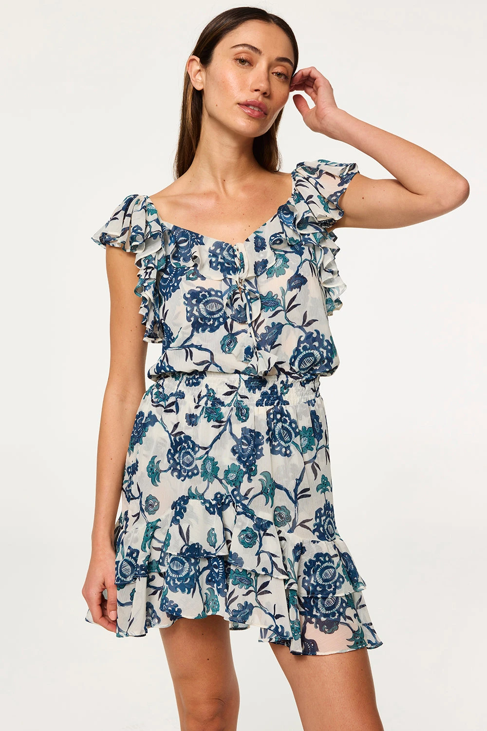 Our Anja skirt is a breezy, feminine silhouette crafted from airy chiffon in our Indigo Teal Blooms print. Designed with a comfortable elastic waistband, it features a double-lined skirt and an asymmetric ruffle-trimmed hem for soft movement. Pair it with the coordinating Luca Top for a fresh, effortless set.