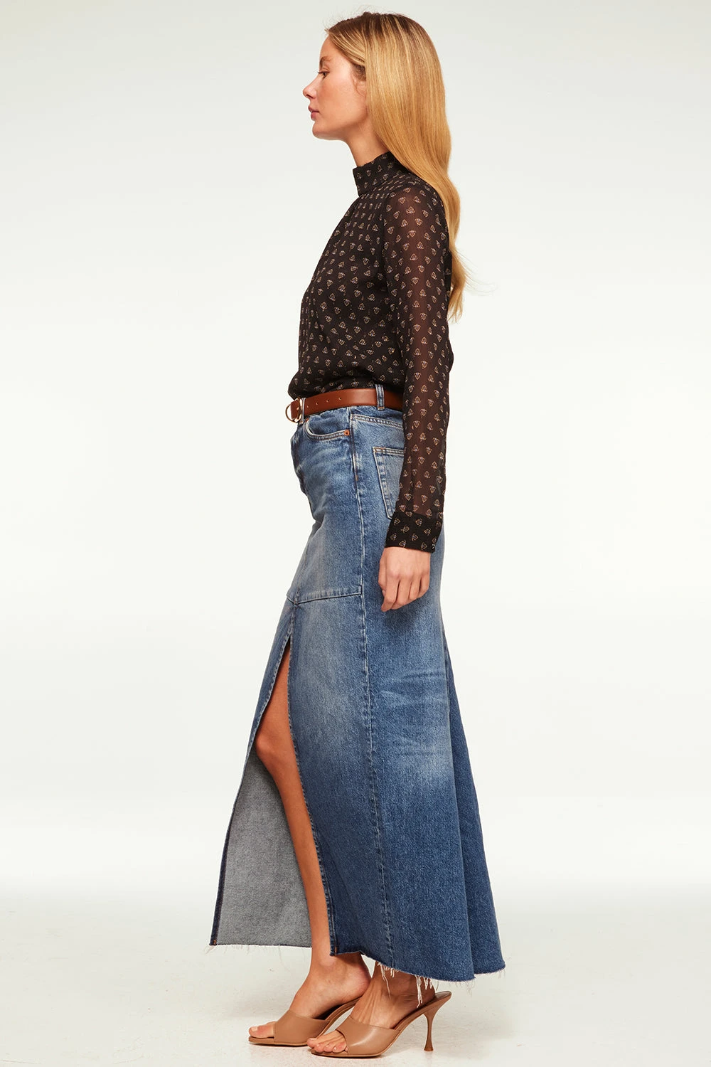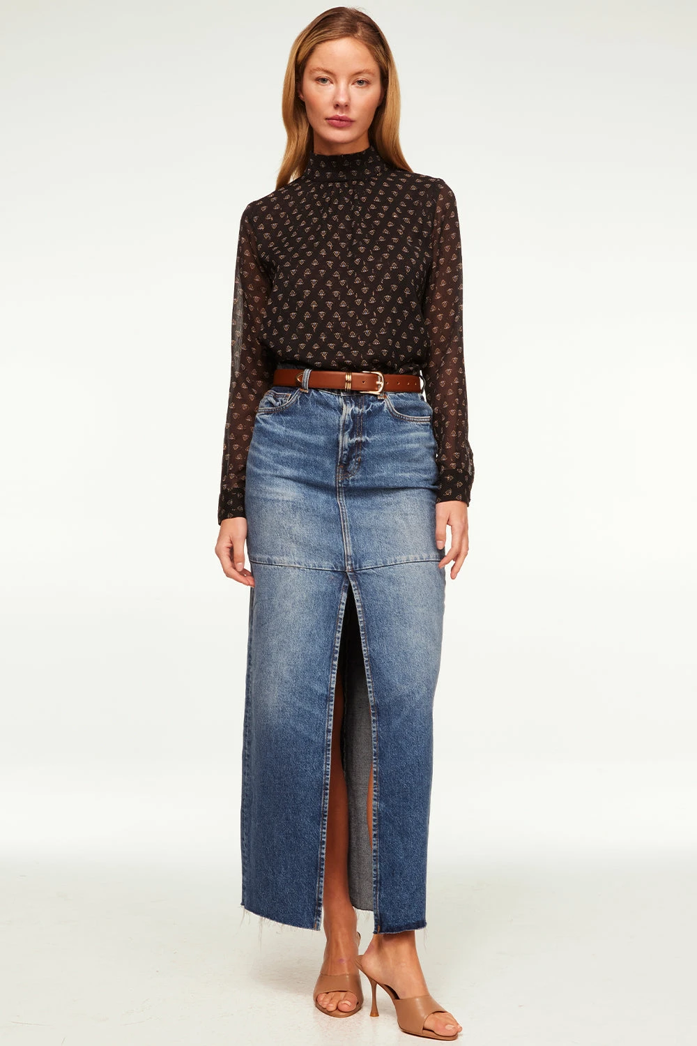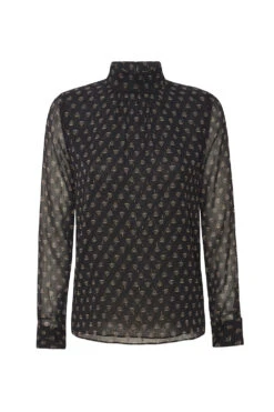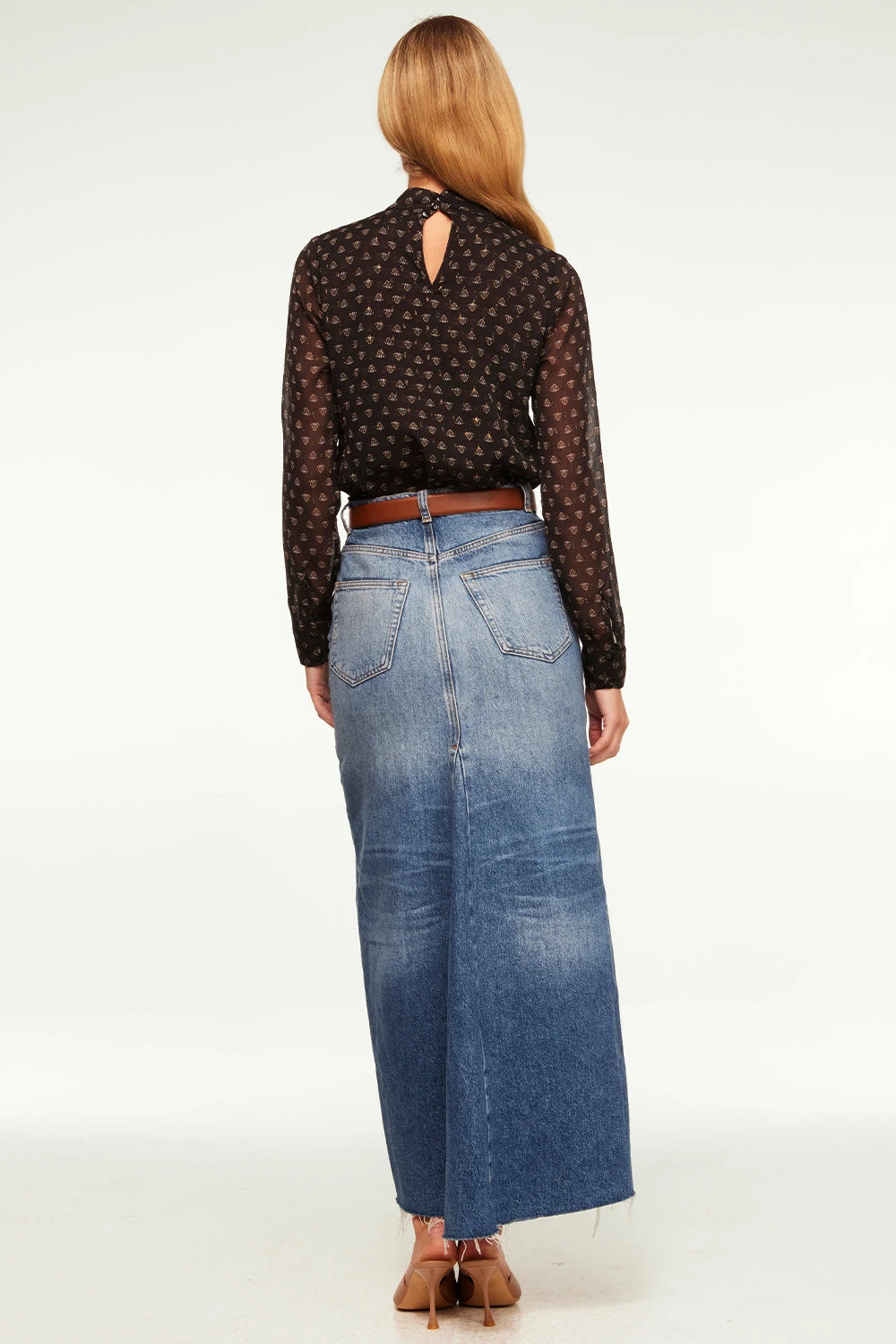 Our new Annie top is cut from a Black Lapis Eye printed crinkle chiffon with lurex clip dots. This high neck silhouette features a keyhole summary back closure and long sheer sleeves. The bodice is double-lined.