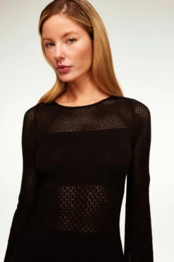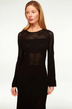 The Anu maxi knit dress is woven from the softest black cotton cashmere blend. This figure-hugging long sleeve silhouette features a high neckline with openwork crochet that leads into a solid body followed by the same bands of openwork crochet with a rolled hem. A variation of our popular Irene silhouette without the open back.
