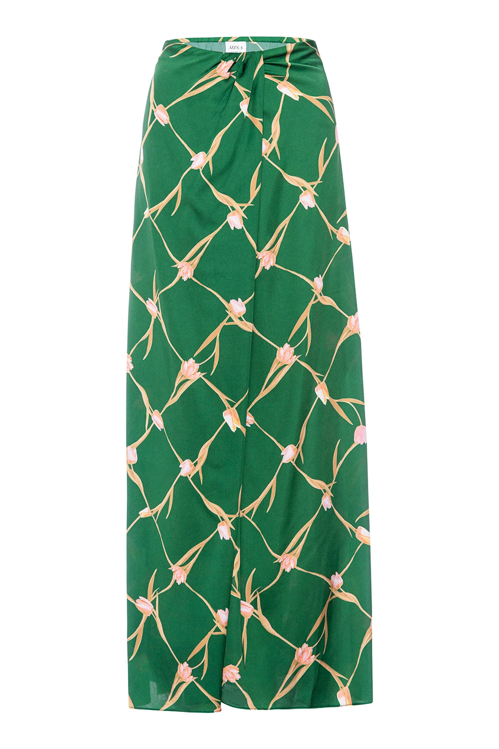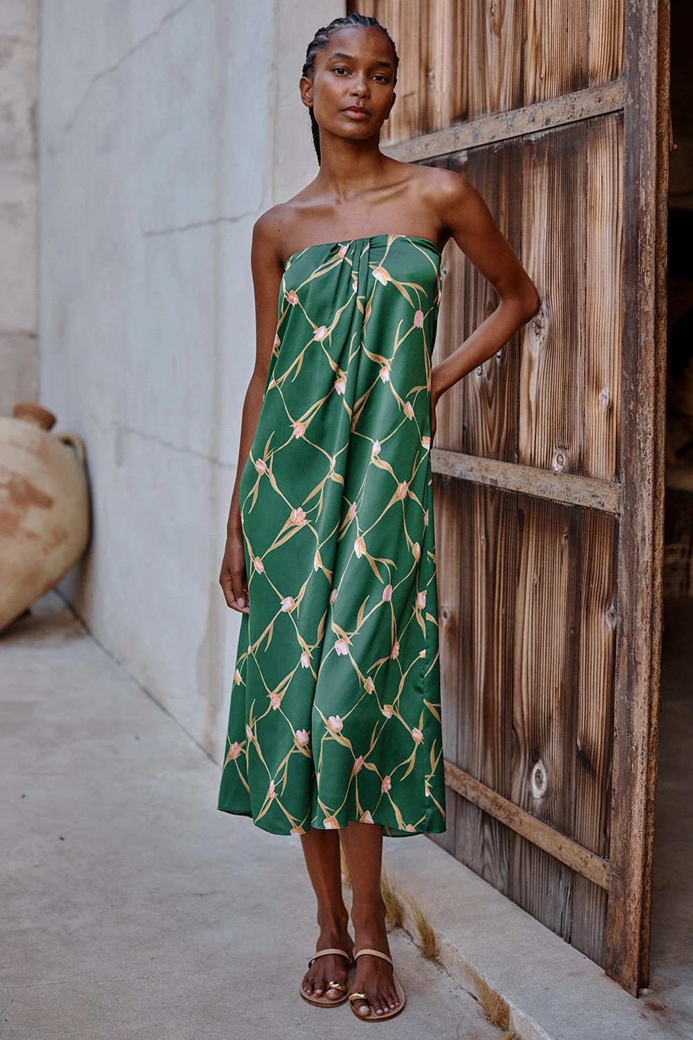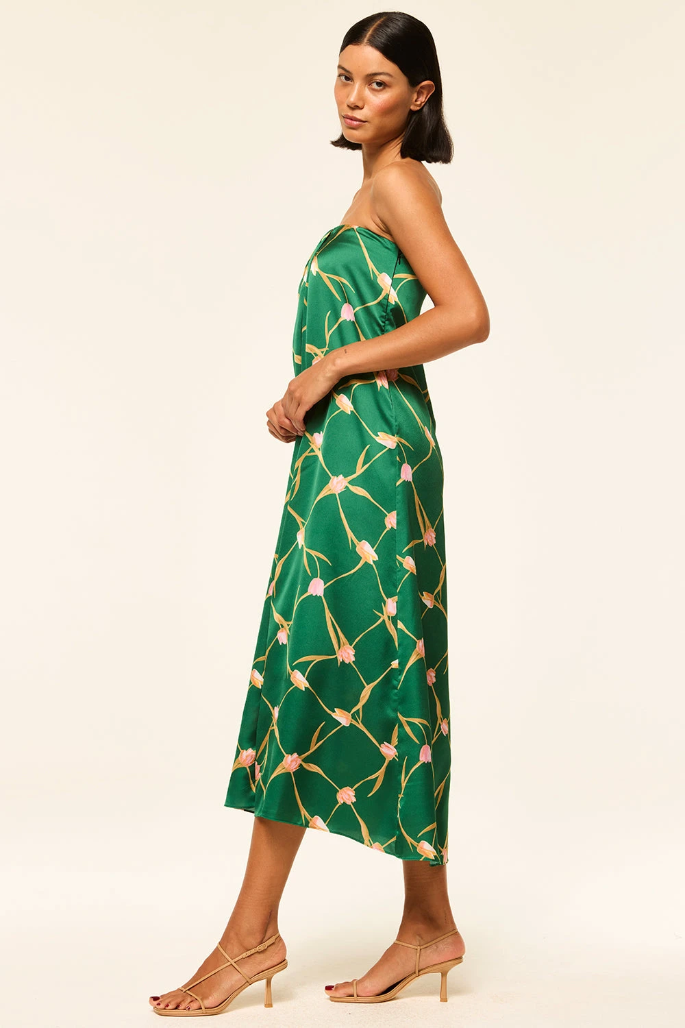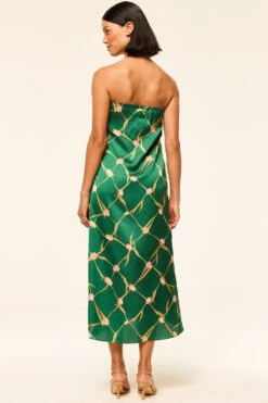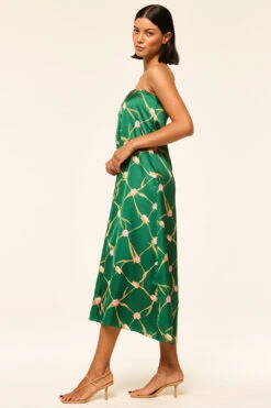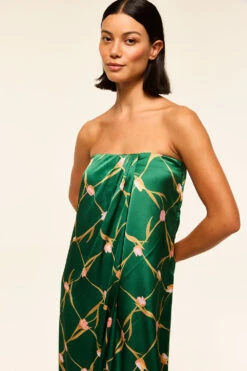 Aurelia is a modern strapless midi dress cut from a Tulip Lattice printed satin in a gorgeous shade of green. A flattering off-center pleat at the bust line gives a wrap dress appearance. An elasticated back with hidden side zip closure. Slightly asymmetric hem. Dress up with heels or pair with flat sandals for the perfect spring style.