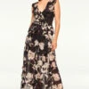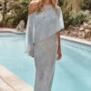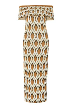 Avi is our newest knit midi dress. This figure-hugging, off-shoulder silhouette is in a brown printed knit jacquard. Fold-over band across the chest leads into a fitted skirt with a back slit.