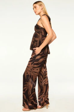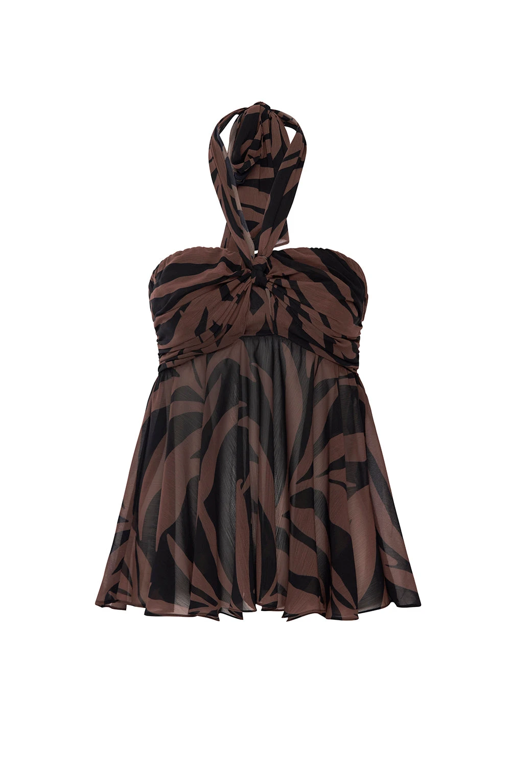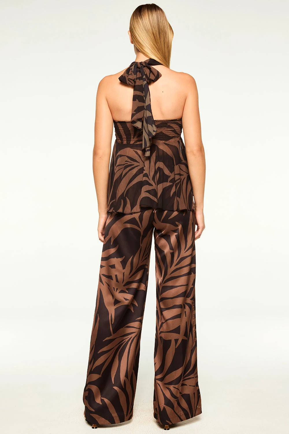 The Aylin is a chic, versatile top in our gorgeous chocolate and black palm frond printed chiffon. Choose to wear either strapless with the tie in a knot, or the around the neck for a halter look. Featuring a smocked back. Style with the the coordinating Reshma pant for an effortless beach to bar ensemble.