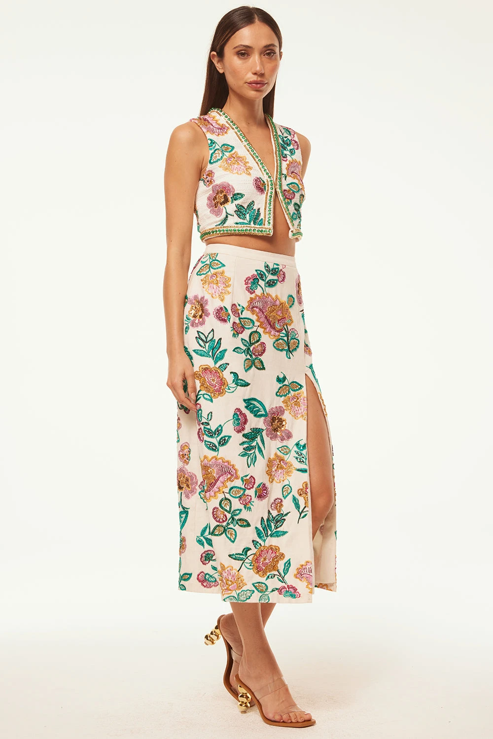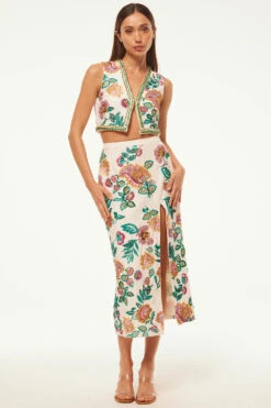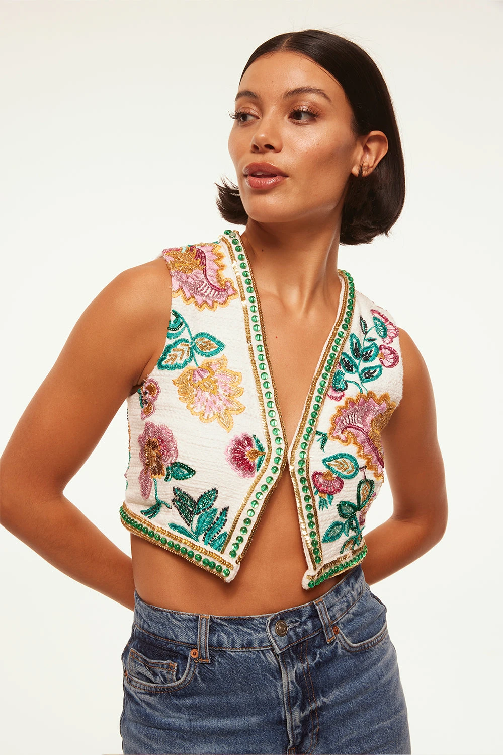 Make in a statement in our newest Bashira vest. Intricate floral hand beading adds dimension and fine detail to this stretch textured cream top. A deep v neckline and hook clasp front closure. Style with the coordinating Thema skirt for an ultra chic head turning look or dress down with denim.