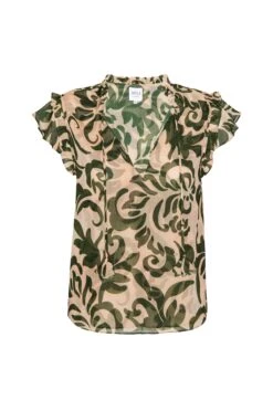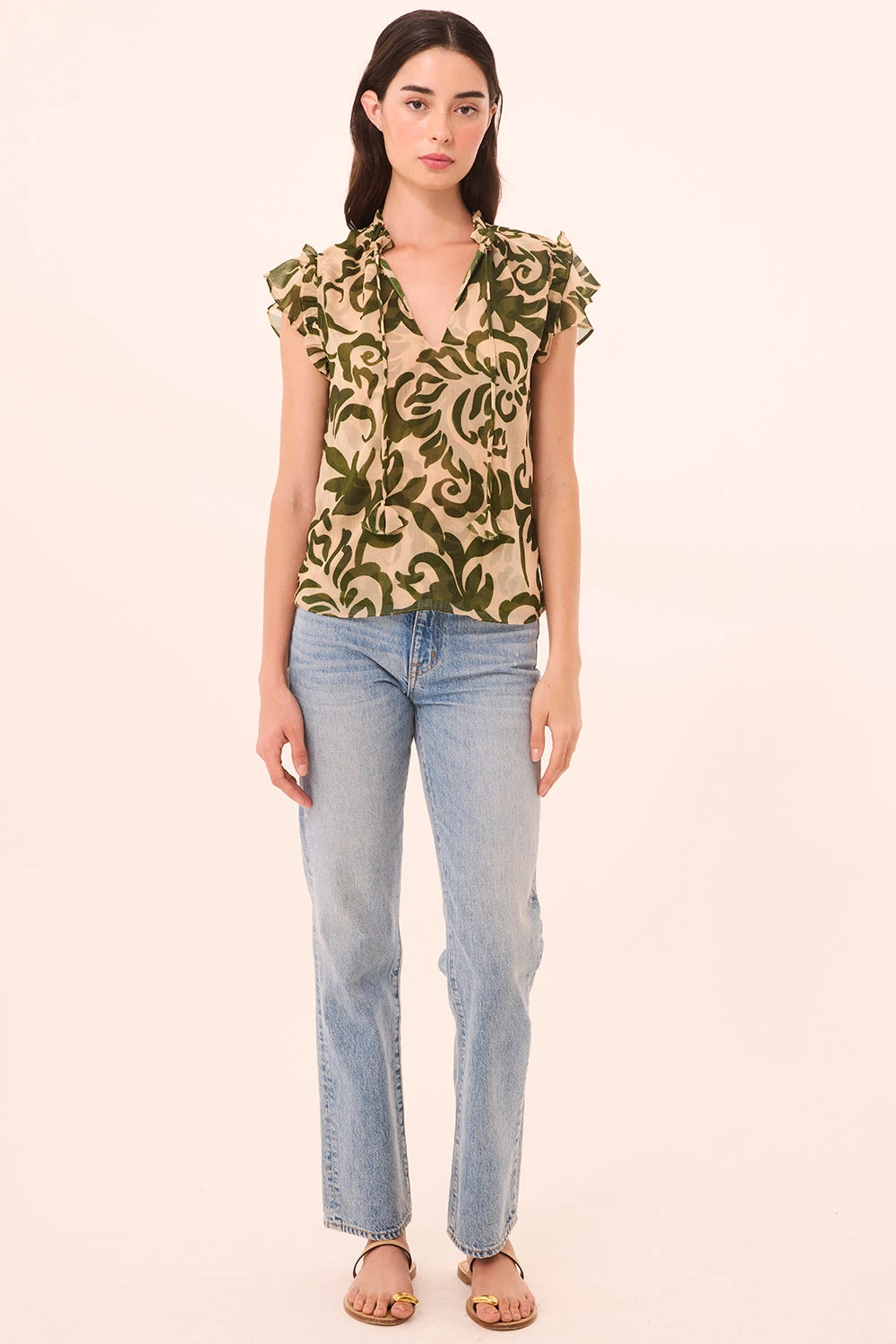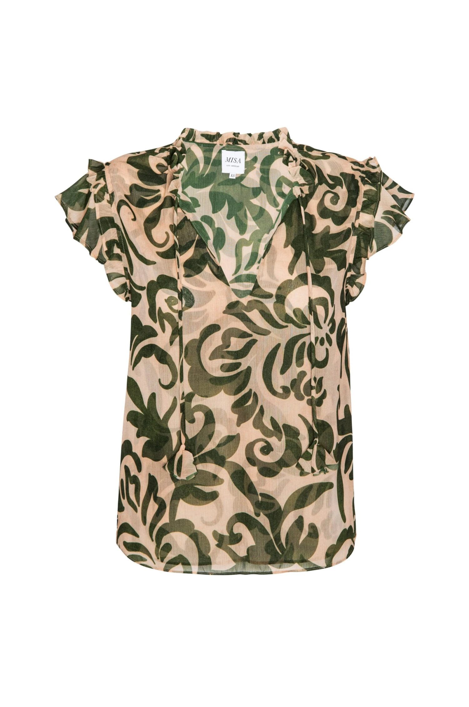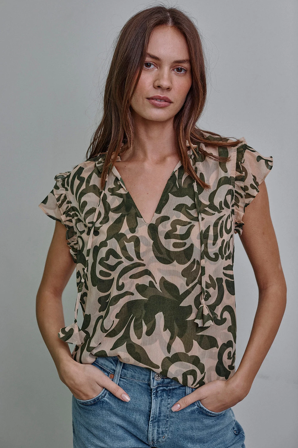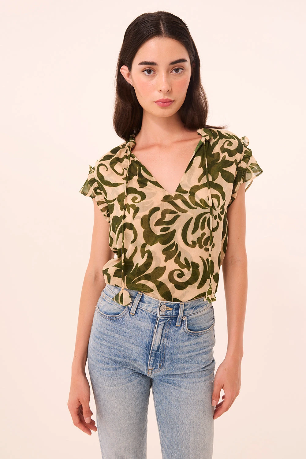 Cut from airy Tonal Cactus print chiffon, our signature Basia top features a relaxed silhouette with short tiered ruffle sleeves and a ruffle-trimmed split neckline, finished with our signature petal tassel ties. Effortlessly versatile, it pairs beautifully with jeans or a solid cotton skirt—perfect for summer and beyond.