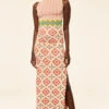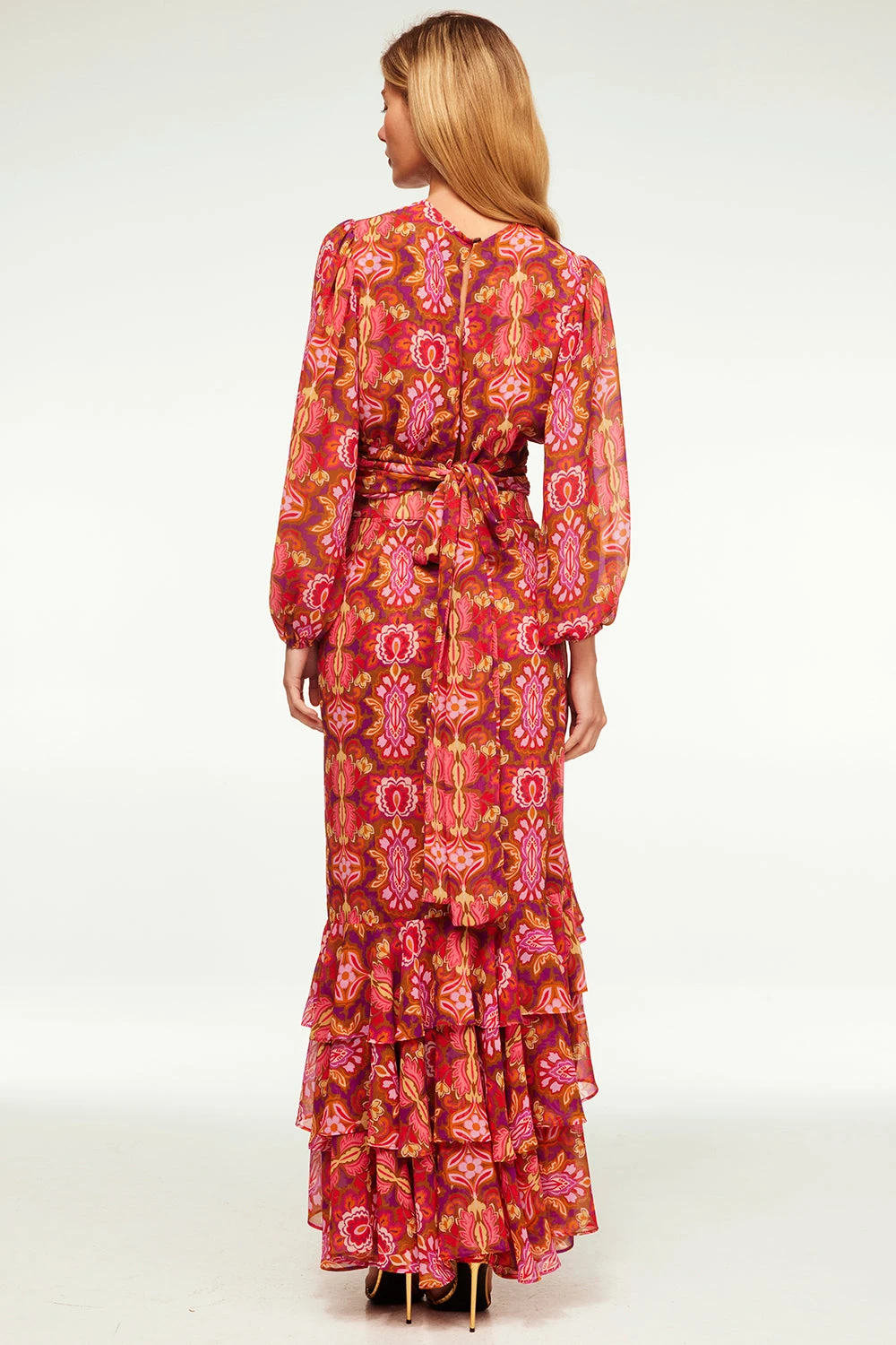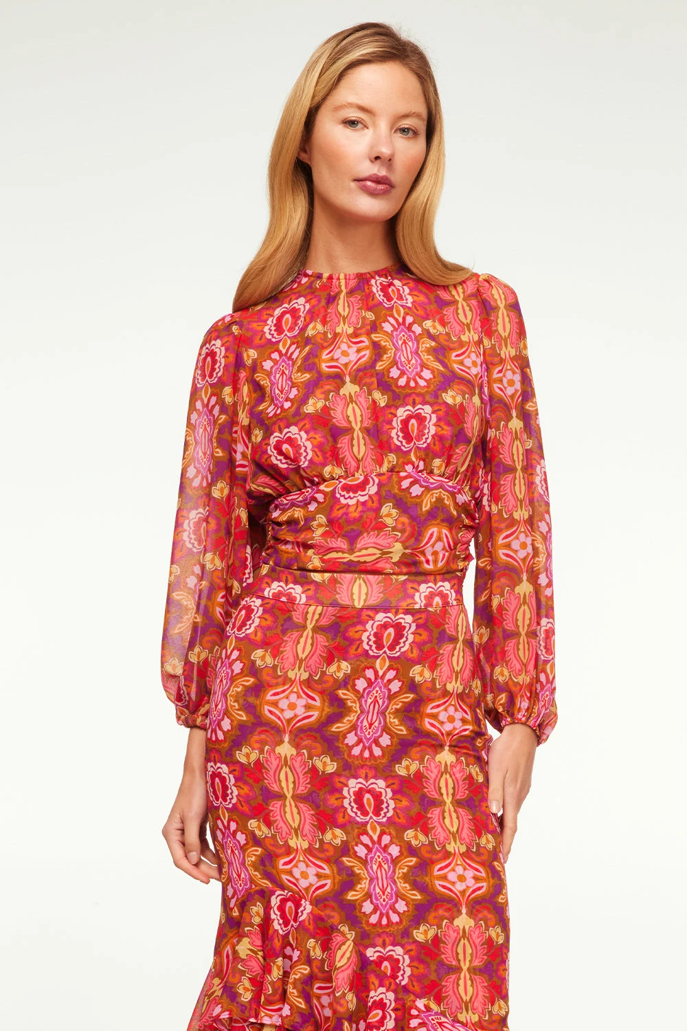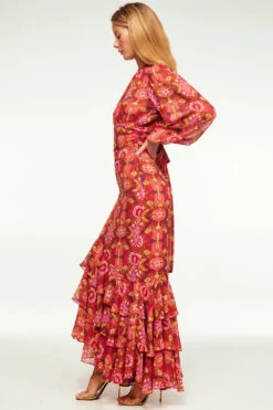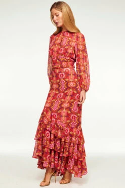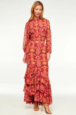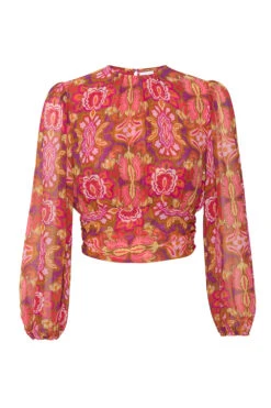 In a vibrant print reminiscent of a bygone era, the Beatriz top standouts this holiday season. It features a high neckline and long blouson, semi-sheer sleeves with elasticated cuffs. An open keyhole back with a single summary closure at the top and the banded waist can be tied in the back or wrapped to tie in the front. Double lined at the bodice. Pair this stunning top with the coordinating Veronique skirt for a head-turning event look or with jeans for a more casual look.