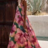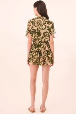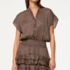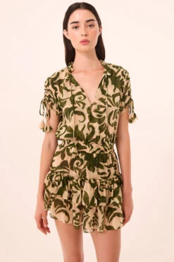 One of our most-loved mini silhouettes returns in fresh Tonal Cactus print chiffon. Designed with a split neckline and adjustable petal tassel ties—mirrored at the sleeves for a balanced touch—this style features a smocked elastic waist that flows into a flirty, tiered mini skirt. Fully lined for effortless wear.