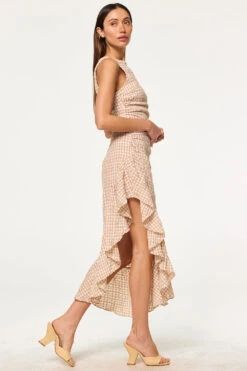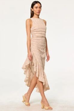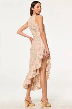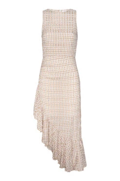 The Bertha dress is a modern midi silhouette cut from a lightweight cotton blend in our distressed Mocha Gingham. Sleeveless with a high neckline, it features a flattering gathered ruching detail at the waist and a hidden back zip closure. The asymmetrical hem is cut on a diagonal and trimmed with a wide ruffle, falling from mid-thigh at its shortest point to mid-calf at its longest. A fresh, feminine take on classic gingham—perfect for everything from brunch to outdoor events.