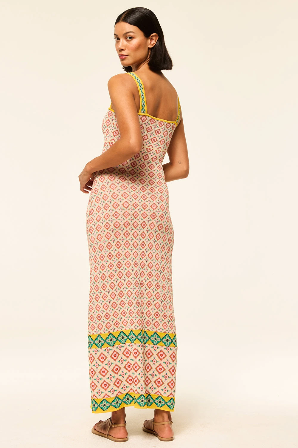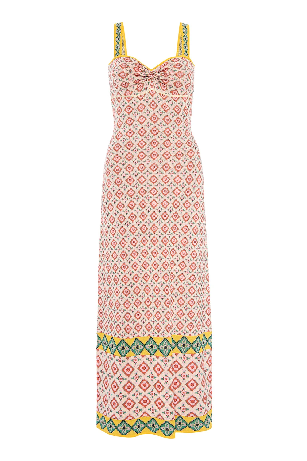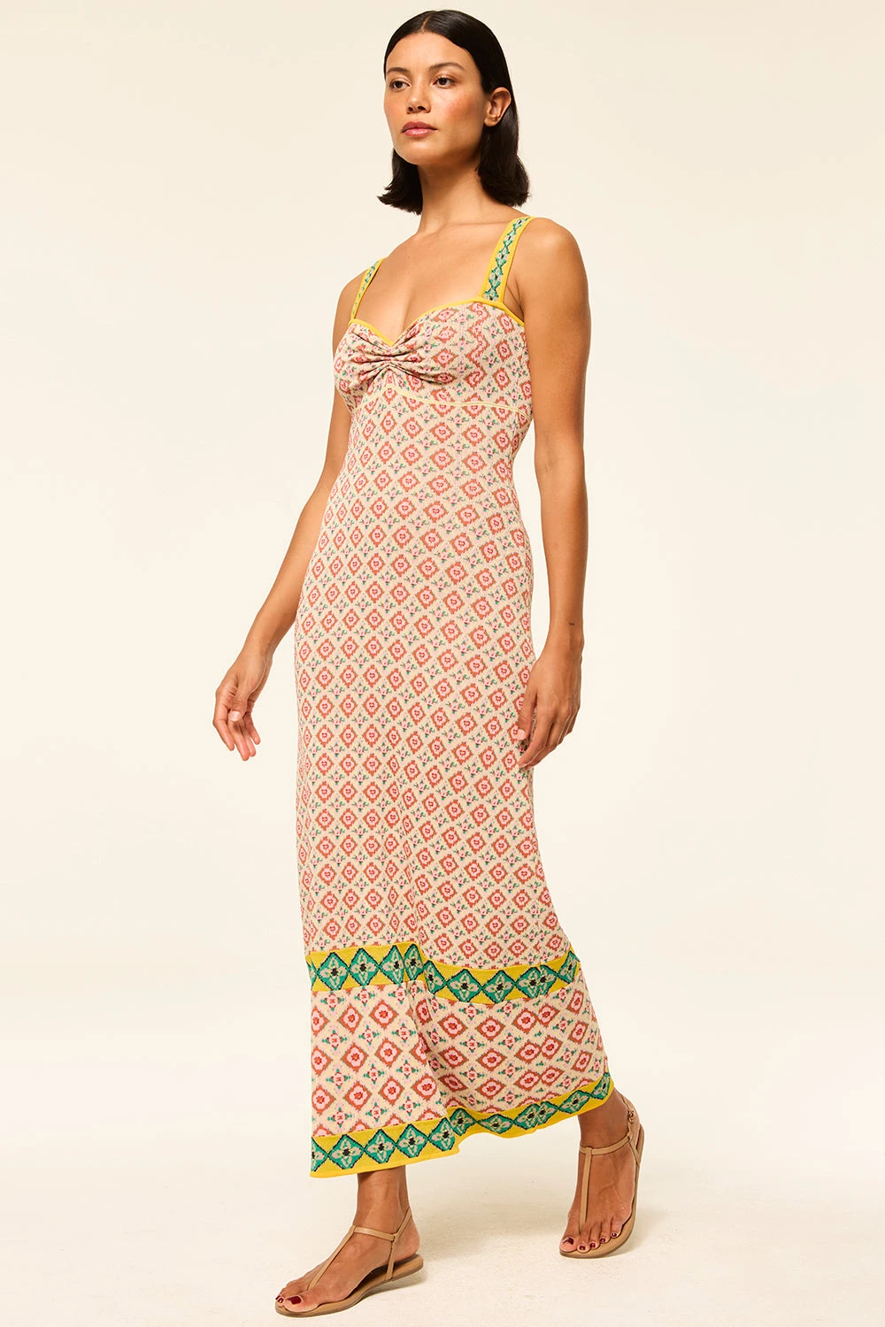 The Bessie dress is a figure-hugging, stretch knit jacquard in a springtime floral block print. This ankle-grazing style features a gathered sweetheart bust line. Contrast printed straps and border print at the hem. Pull-on style. Pair with flat sandals or dress up with heels.