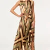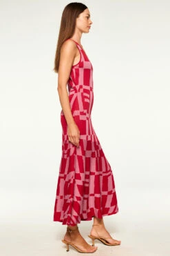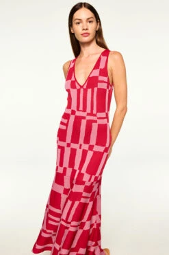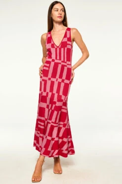 Our new Brenna dress is a standout two-tone pink and red knit midi in a modern geometric pattern. Sleeveless with a deep v-neckline. A fitted silhouette leads into a slightly flared fluted hem. Wear this figure-flattering silhouette with everything from heels to flats.