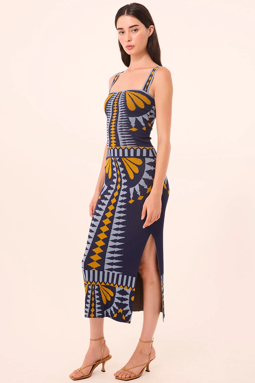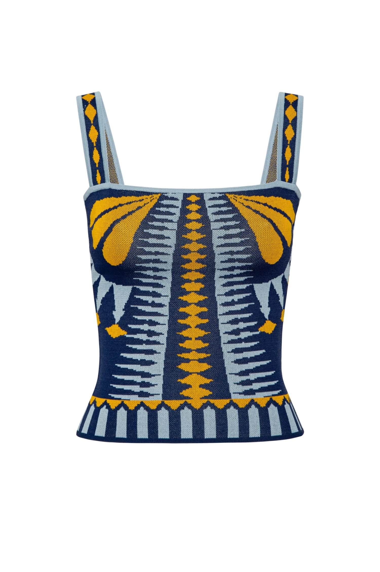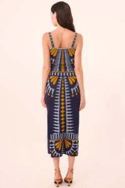 Briar is a fitted stretch knit jacquard top featuring an abstract Butterfly print that feels sophisticated and artful. Sleeveless with a clean square neckline and slender straps, it offers a sleek, modern silhouette. Pair it with the coordinating Keyah skirt for a polished, head-to-toe statement.