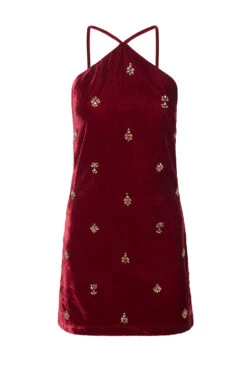 Stun this holiday season in the fête-ready Camille dress, cut from a rich garnet velvet and embellished with hand embroidered rhinestone clusters. This body-hugging, chic mini features a halter neckline with thin adjustable straps and a hidden back zip closure. Pair with gold strappy heels and a clutch for your next soirée of the season.
