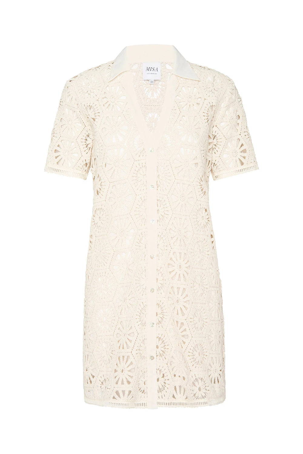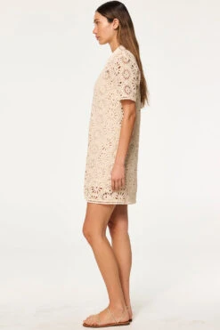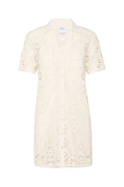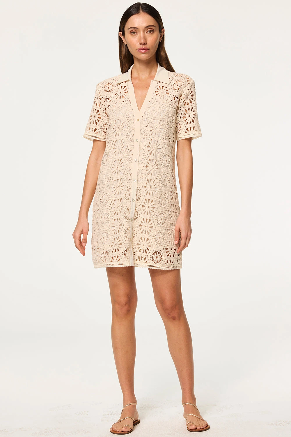 Carmel is a summer-ready shirt dress crafted from beige cream crochet. Designed with short sleeves, a V-neckline, and a fold-over collar, it features a full summary front and delicate lace-embroidered details at the hem and sleeves. Comes with a removable tonal slip dress for added coverage. A versatile mini that transitions effortlessly from daytime to dinner.