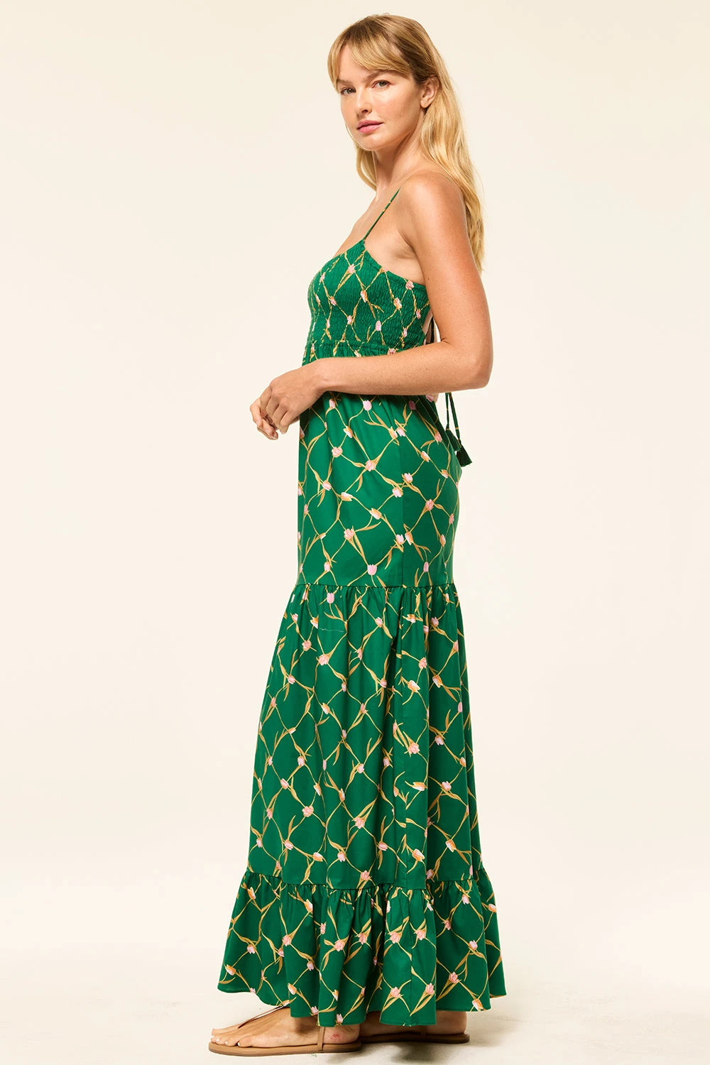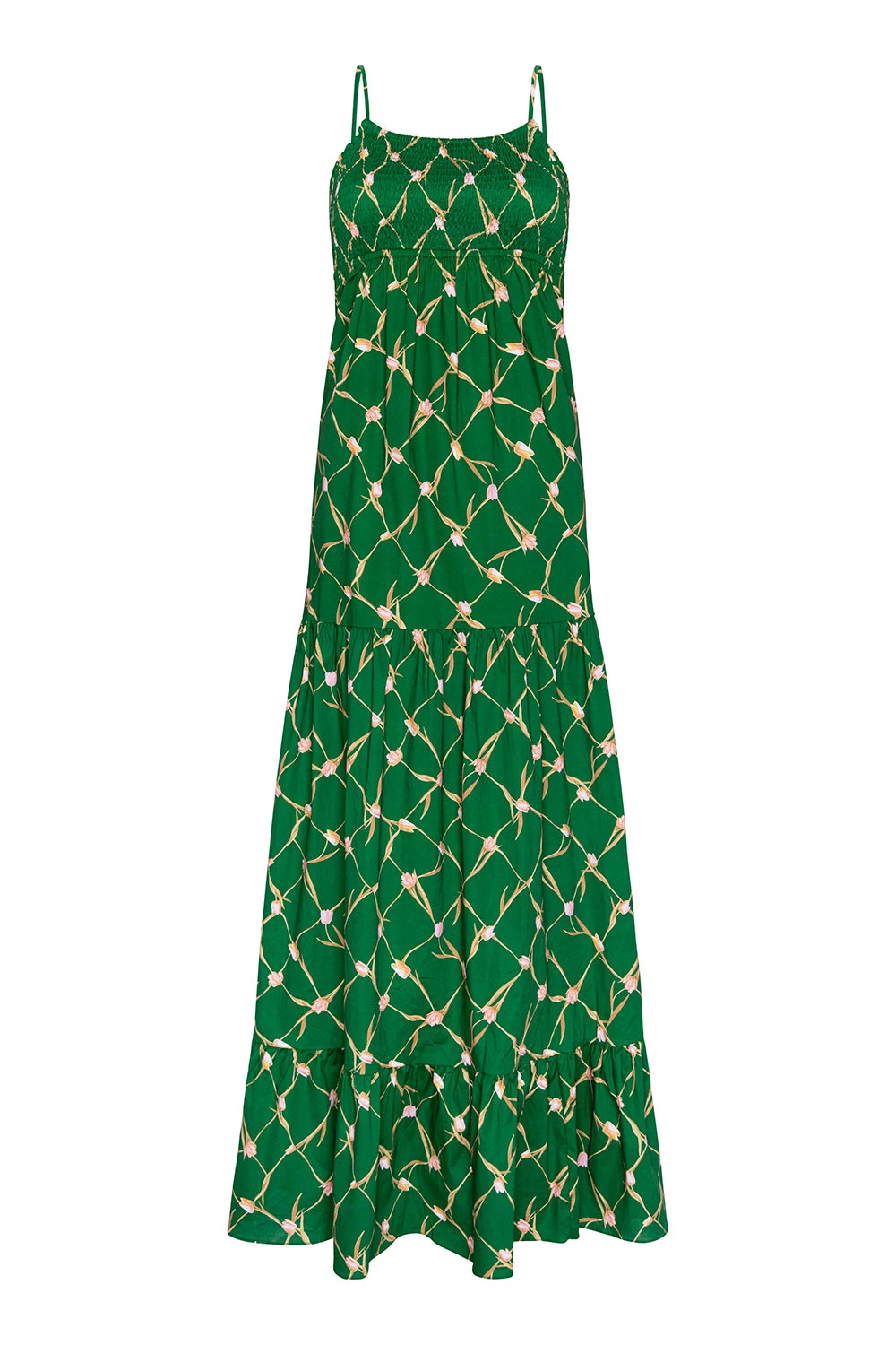 Carmela is a fresh spring maxi dress cut from a Tulip Lattice print cotton poplin in a fresh shade of green. Featuring a flattering smocked bodice and adjustable spaghetti straps with an open-back tie detail. A tiered, ankle-grazing skirt with wide ruffle hem.