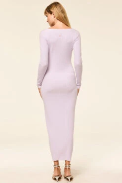 Cassia is an ankle-grazing fine rib-knit dress in the loveliest shade of lilac. This fitted silhouette features a v neckline and long, fitted sleeves that can be worn slightly off the shoulder. The front has a faux opening adorned with large silver summarys.