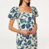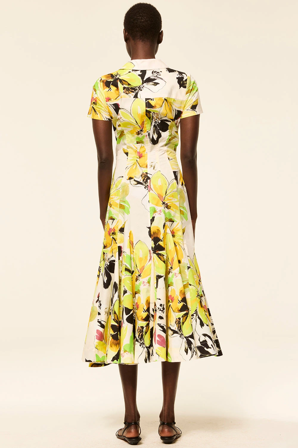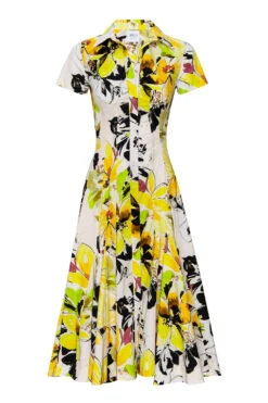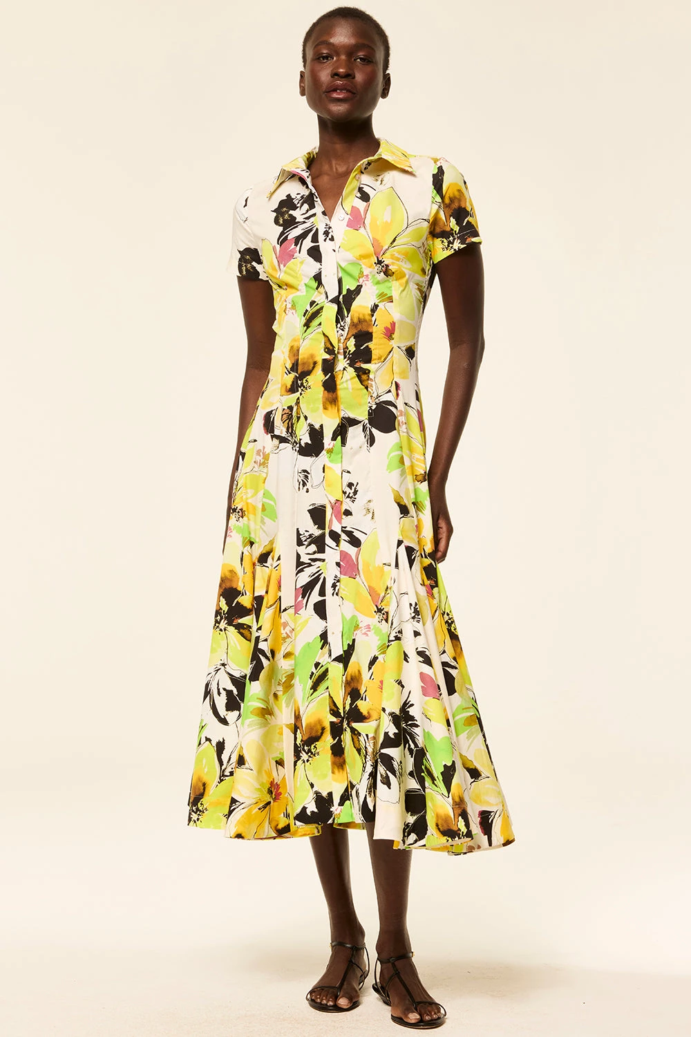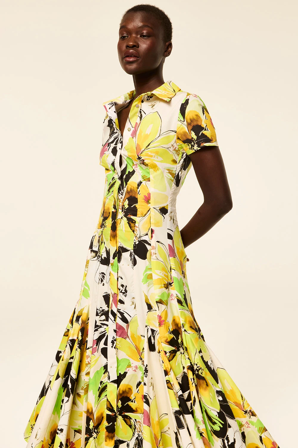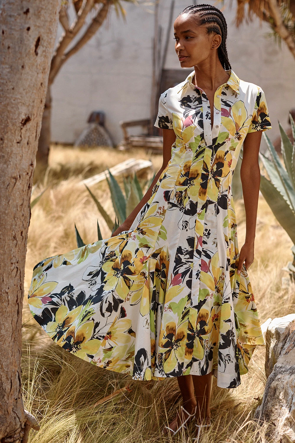 Charlene is our newest Spring midi silhouette cut from a vibrant Lucent Blooms cotton poplin. This pleated short sleeve shirtdress silhouette features a spread collar and summary front. A-line silhouette with a hem that falls just below the knee. This easy Spring dress can be dressed up with heels or paired down with flats.