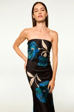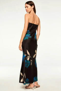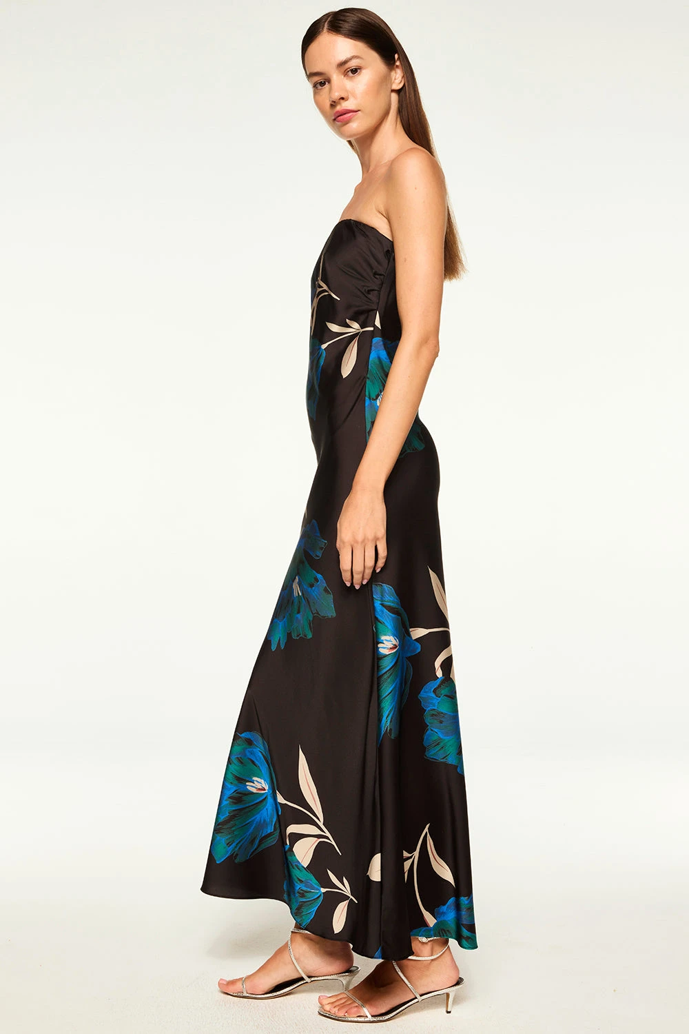 Our strapless Cheryl dress is the perfect transitional piece to carry you into Spring. This maxi silhouette is cut from a silky satin printed with a Nightshade Flora motif. Cut on the bias with a hidden side zip. Wear with everything from strappy heels to flats.