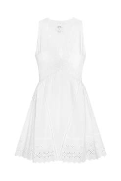 Cicely is a light and easy mini dress cut from cream cotton eyelet. A deep V neckline is framed with delicate embroidered eyelet, mirrored under the bust by a floral eyelet band. Pintuck detailing through the bodice adds subtle structure, while angled seams and inset lace lend definition through the skirt. Finished with a scalloped, eyelet-trimmed hem and a hidden back zipper, this style pairs effortlessly with flats or sandals for a look that moves easily from spring into summer.