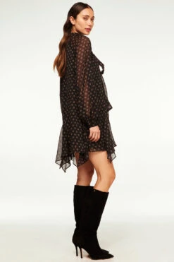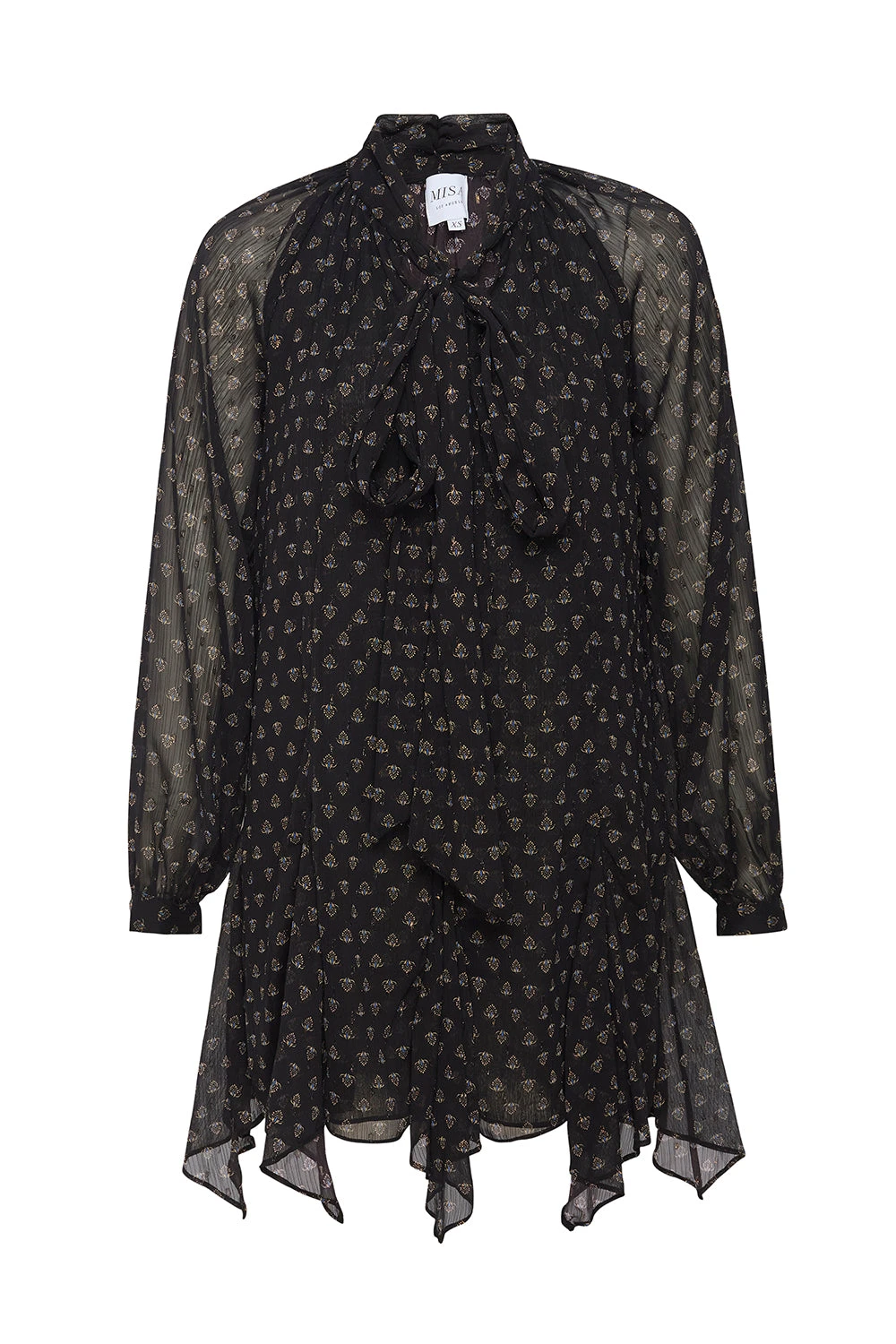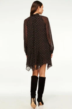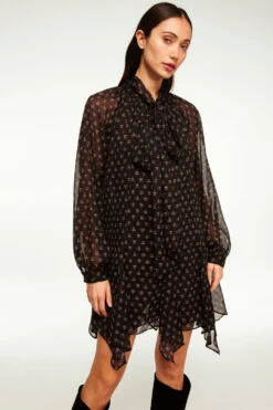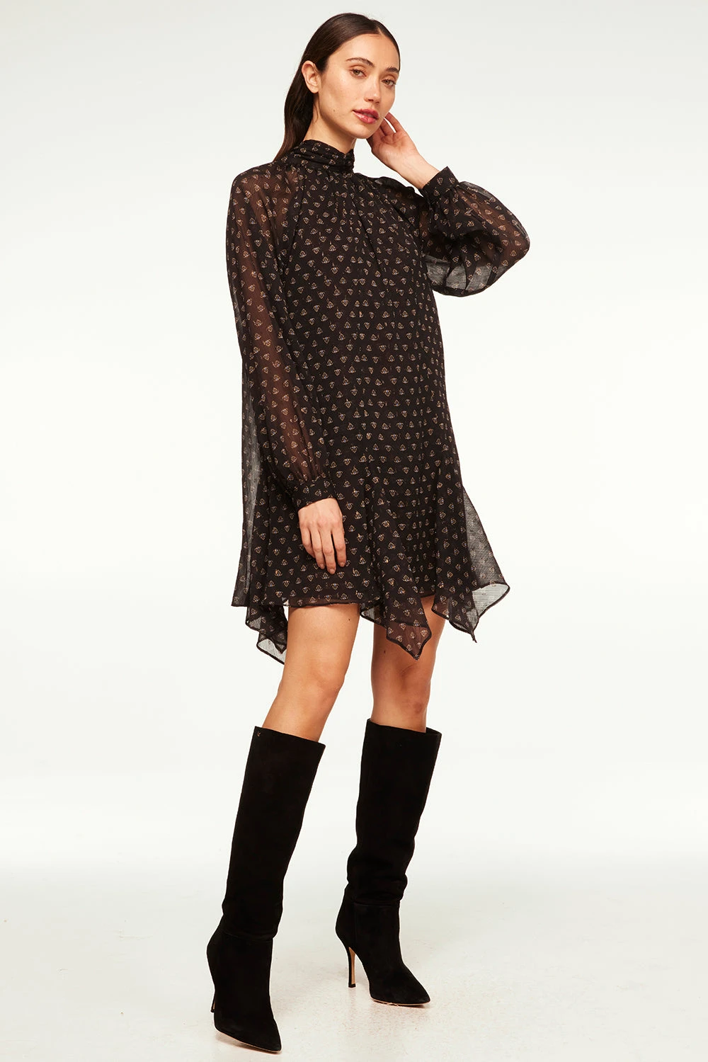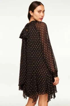 Cindy is a mini length dress cut from our Black Lapis Eye printed crinkle chiffon with lurex clip dots. The loose body is double lined and long sheer blouson sleeves are finished off with summary cuffs. A high neckline features a tie bow detail. Wear with bow tied in back or front for a versatile look. Finished off with a playful handkerchief hem.