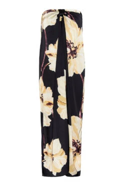 Introducing Clea, a new strapless midi silhouette cut from golden poppy printed satin set against a black ground. A gathered faux knot at the bust creates soft, flattering draping that flows into a relaxed skirt, while the fitted bodice and side zip offer a secure, sculpted fit through the bust. An effortless option for a barefoot beachfront wedding or elevated with heels for a summer celebration.