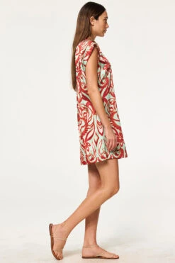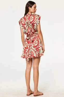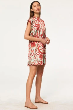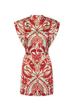 Cyrene is a modern mini shift cut from our stunning red and mint green Vintage Botanical–printed satin. Featuring a mock neckline and relaxed cap sleeves, this easy silhouette includes a removable self-tie belt to cinch the waist or wear loose for a more effortless shape. Pair with heels or flats for a bold, versatile look that transitions with ease.