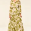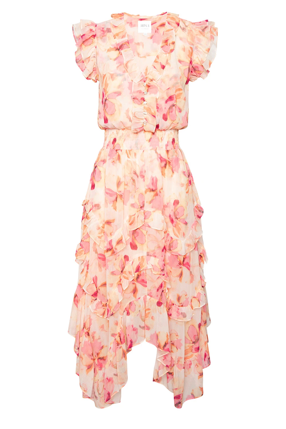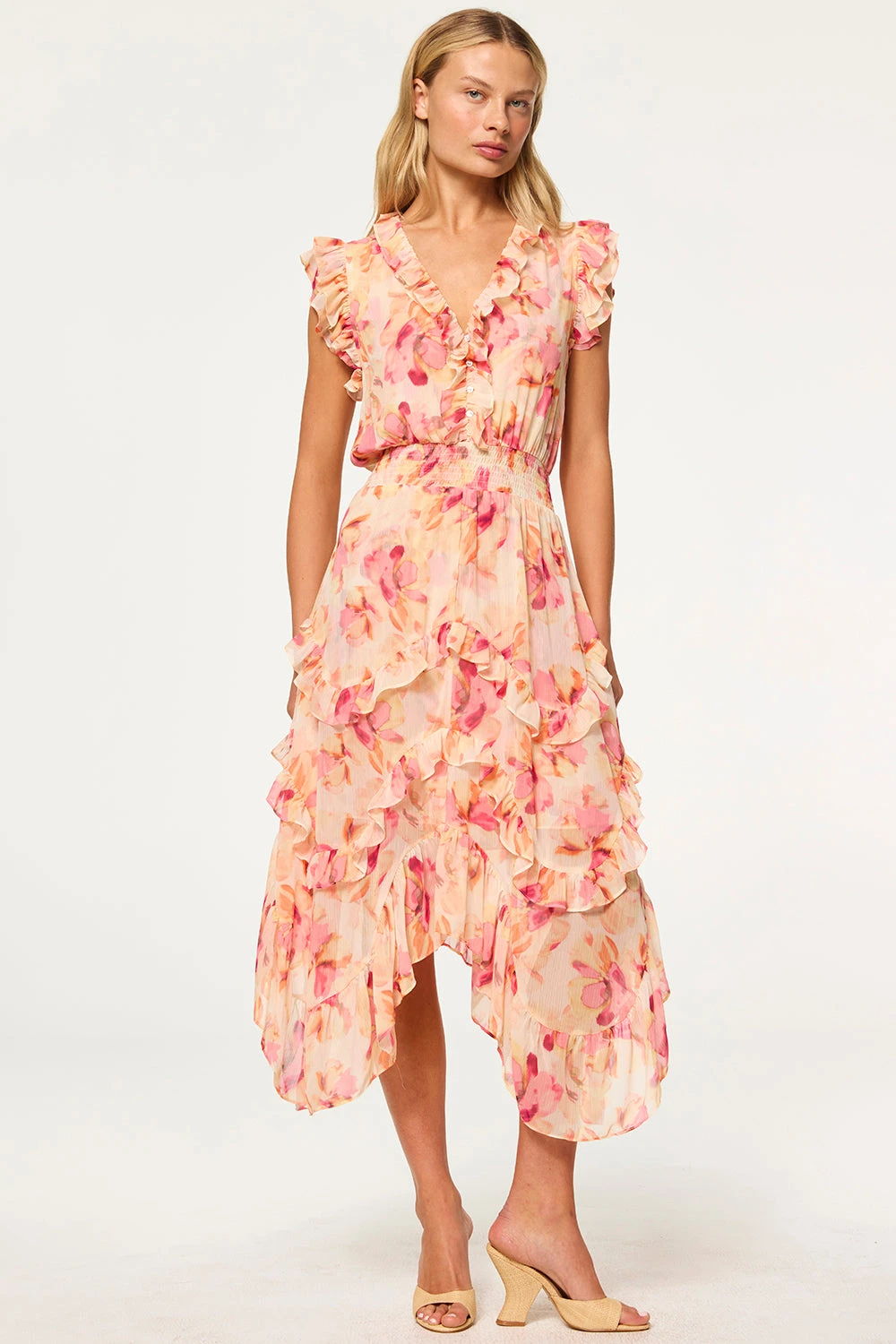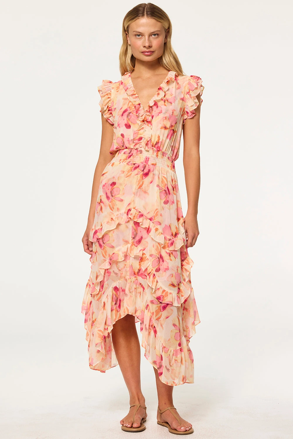 Chic and universally flattering, the best-selling Dakota is a playful yet polished midi dress designed to take you seamlessly from desk to dinner. Cut from a flowing Watercolor Floral print chiffon, it features a summaryed V-neckline framed with soft ruffle trim and delicate ruffle accents at the shoulders. A smocked elastic waist cinches the silhouette, flowing into a tiered, ruffle-trimmed hem.