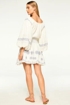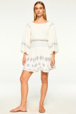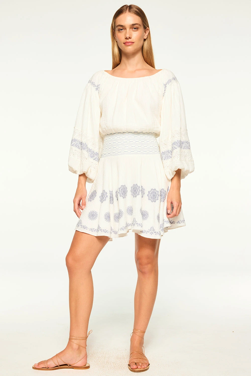 Daliya is an effortless getaway-ready mini dress to carry you into the warmer seasons. This off-the-shoulder style is cut from a breezy cotton gauze and features long voluminous sleeves with elastic cuffs trimmed in tonal lace with blue embroidered details. The blouson top is accentuated with a wide smocked embroidered waistline and leads into a flowing skirt with embroidered blue medallions. Fully lined. This pack-and-go style is a timeless addition to your warm-weather wardrobe.