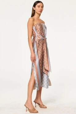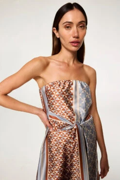 The Damalis dress is a modern strapless midi cut from our sleek Checkered Tile–printed satin. Designed with an elasticized neckline for a secure fit, it features an attached wide sash that can be tied in front or back for versatile styling. Double side slits and the fluid drape give it a scarf-like effect, while a hidden side zip ensures a smooth fit. Effortlessly striking and easy to style for any occasion.