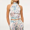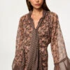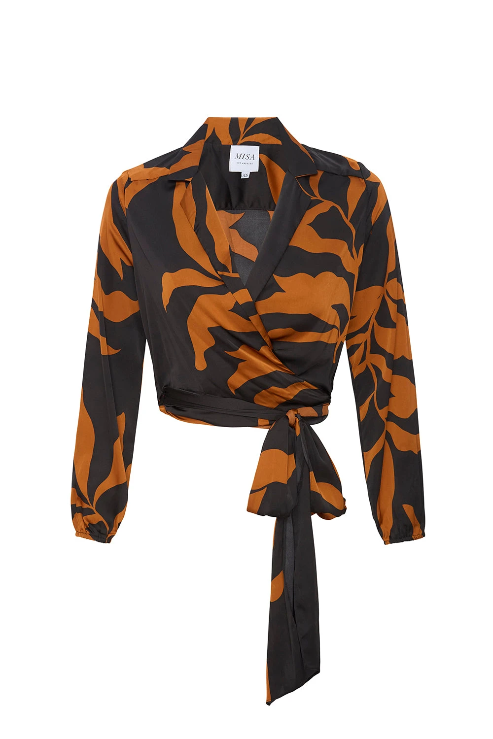 Darcy is a lovely wrap blouse cut from a botanical Fernal Glow printed satin. A v neckline with notched collar. Long voluminous sleeves with elastic cuffs. Yoked back with a self-tie waist. Pair with the coordinating Shelley skirt for a fall-worthy set.