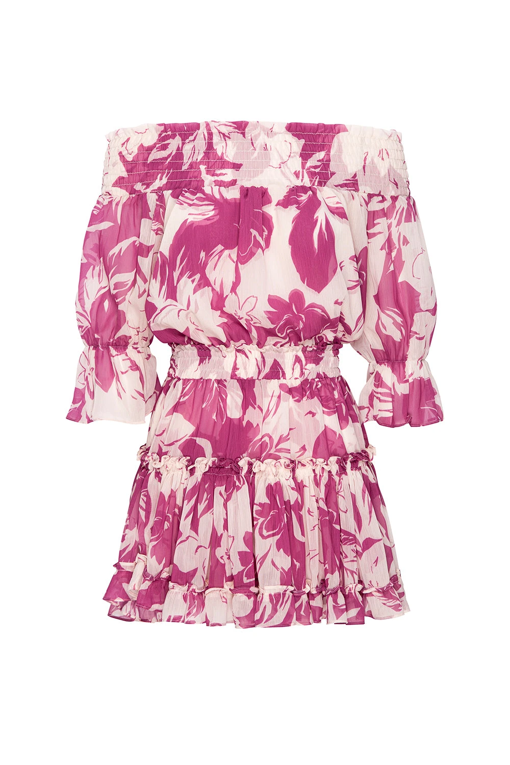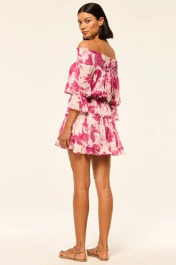 Darla is a classic off-the-shoulder mini dress crafter from a Fuchsia Flora printed chiffon. The smocked neckline and elastic waist provide a comfortable, flattering fit, while the three-quarter sleeves with ruffle accents add a playful touch. The tiered skirt with a slightly asymmetric hem is adorned with delicate ruffles, creating a breezy, feminine silhouette that’s perfect for spring and summer days.