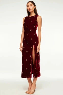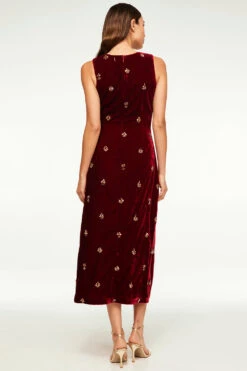 Stun at your next soirée in our luxe velvet Delaney dress. This sleeveless, high-neck, midi silhouette features a daring front slit and hidden back zip closure. Lined. Adorned with hand embroidered rhinestone clusters allover. Pair with gold strappy heels for a look that will carry you through the new year.