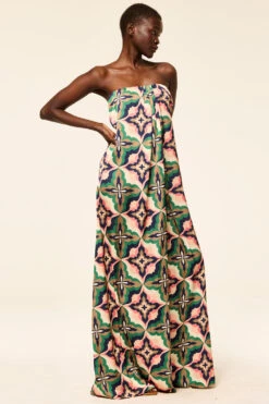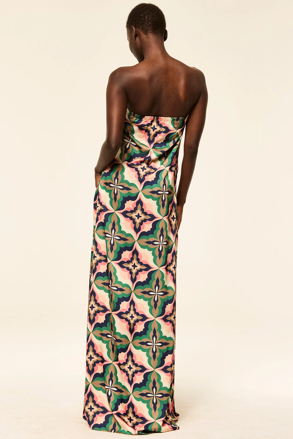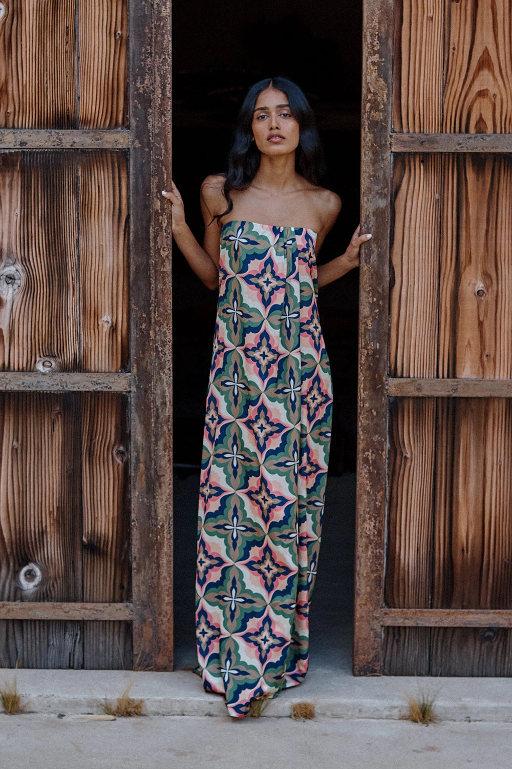 Divina is an effortlessly striking strapless maxi cut from our vibrant Prismatic Tile Coral–printed satin. Featuring soft front pleating and a clean, flowing silhouette, this style is finished with a hidden side zip closure for a seamless fit. Dress it up with heels or style it with flats for an easy, standout look.