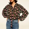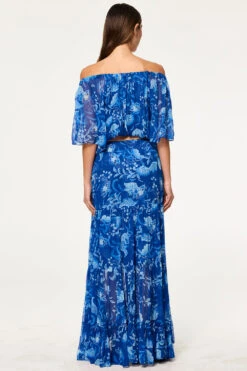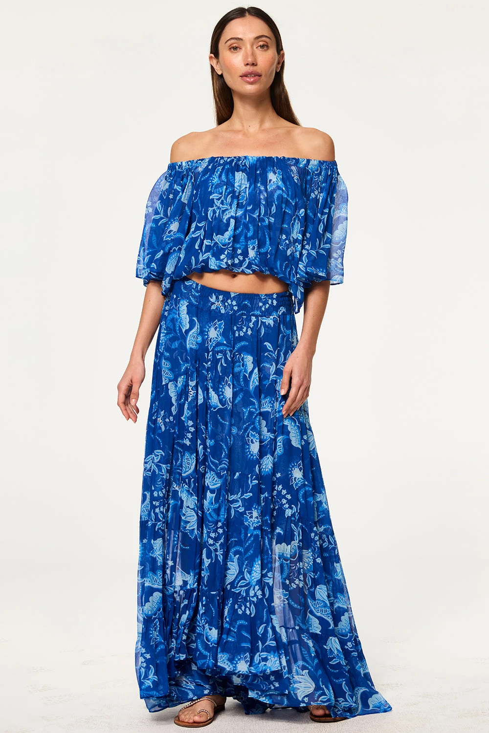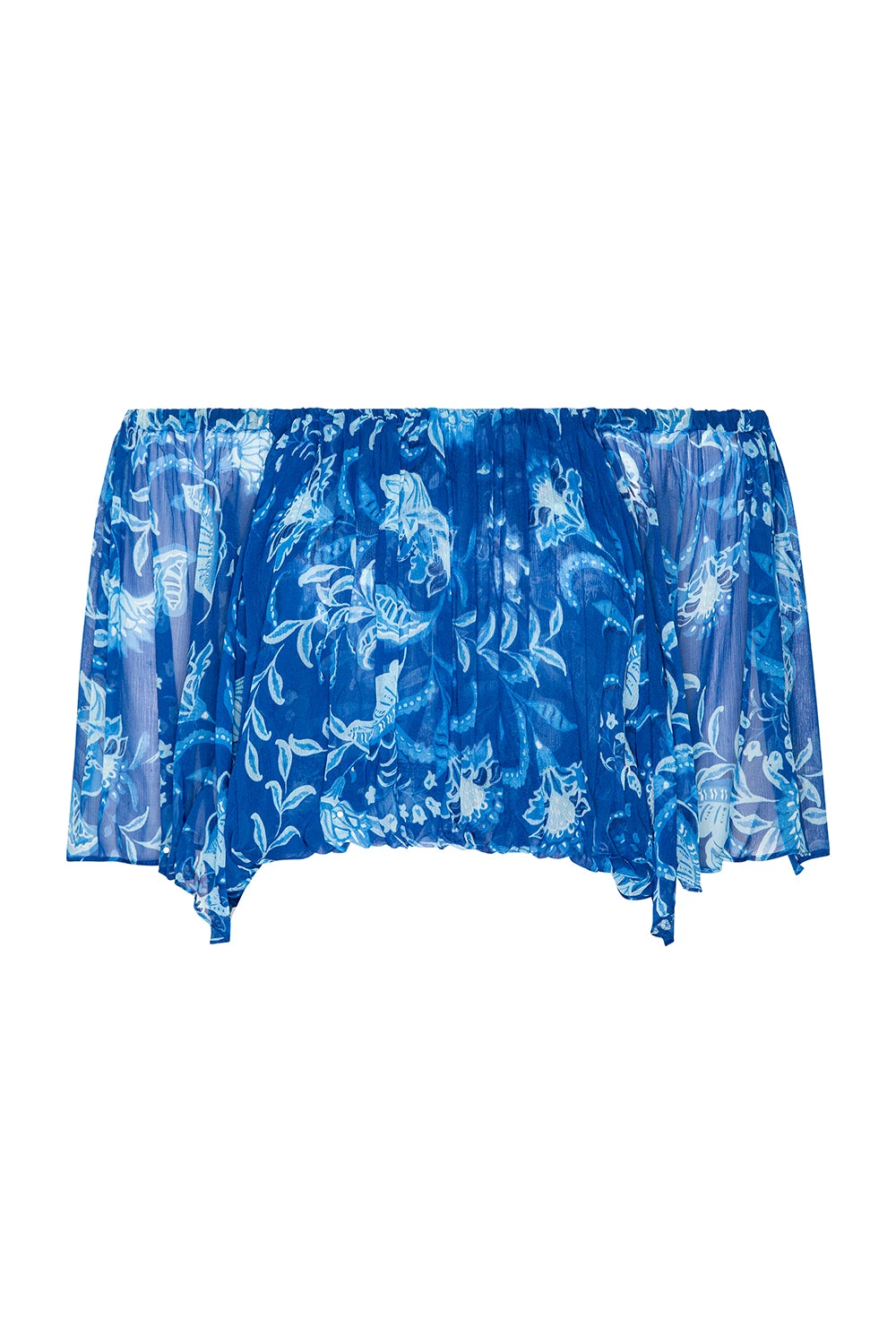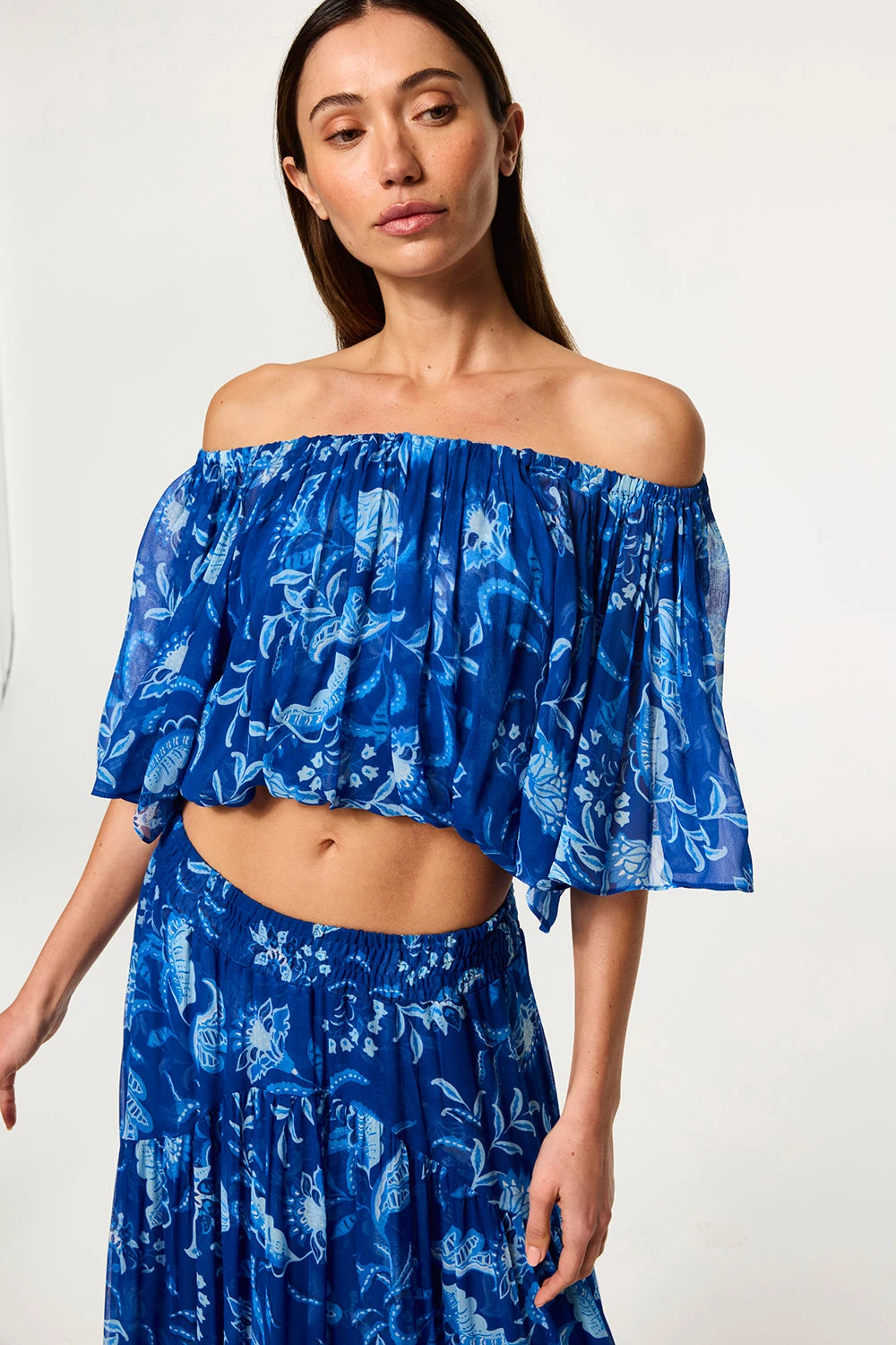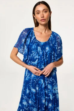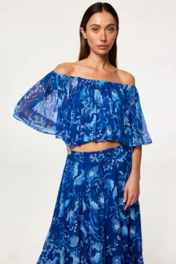 Dylan is a breezy, bohemian cropped blouse cut from vibrant Fiji Blue–printed chiffon. Designed with a blouson fit, it features an elasticated neckline and hem that can be worn on or off the shoulder. Double lined through the bodice with short sheer sleeves, it pairs perfectly with the coordinating Marie Skirt for an effortless, free-spirited look.