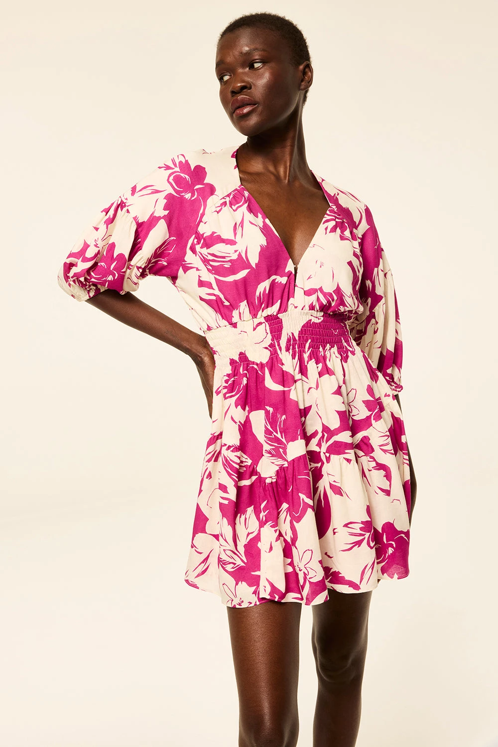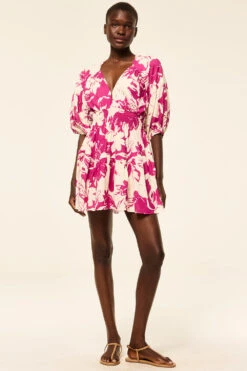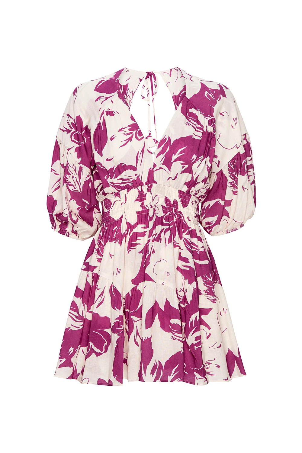 In a silhouette that flatters every figure, our Eight dress is crafted from a beautiful Flora Fuchsia printed rayon-linen blend. The deep V-neckline with a hook-and-eye closure meets at the smocked, elasticated waist, while elbow-length voluminous sleeves add a touch of softness. The open back, featuring a self-tie closure, completes the look. This effortlessly feminine style is perfect for this season and beyond.