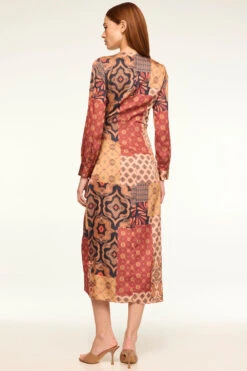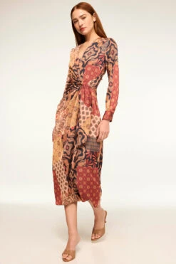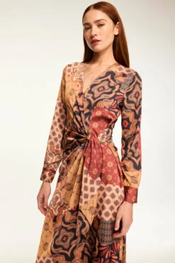 Eliza stuns in our fall-ready Surreal Patchwork satin. This chic midi dress is a wrap style with a gathered self-tie waist. A v neckline with long sleeves and summary cuffs. Pair with everything from knee high boots to mules.