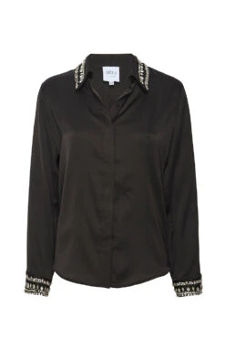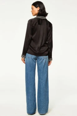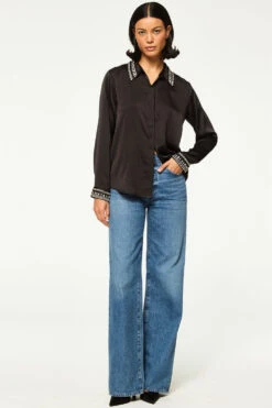 Ellie is a chic holiday update to your favorite summary down shirt. Featuring a rhinestone embellished collar and cuffs. Cut from black satin with a full hidden summary front placket. Dress up your favorite pair of jeans or wear with our coordinating Leia satin pant for a stunning holiday set.