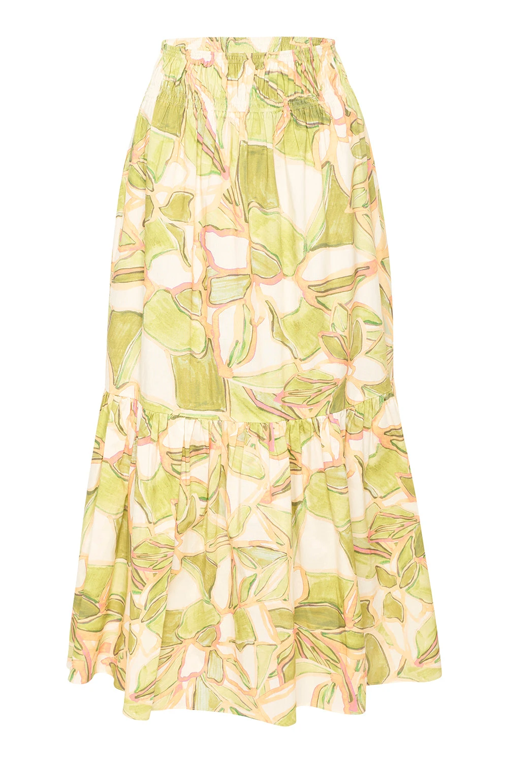 The Elna Skirt is a timeless ankle-grazing maxi cut from cotton in a soft Chartreuse Abstract print. Designed with elasticized ruching at the waist, side slit pockets, and a wide ruffle hem, it offers both ease and elegance. Pair it with your favorite tee or the coordinating Halia top for a chic, monochromatic look.