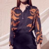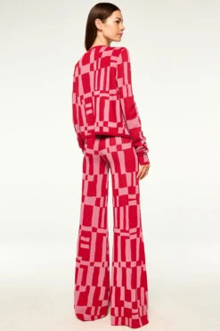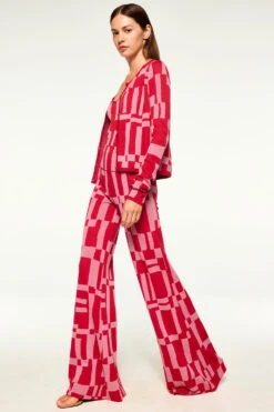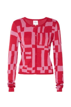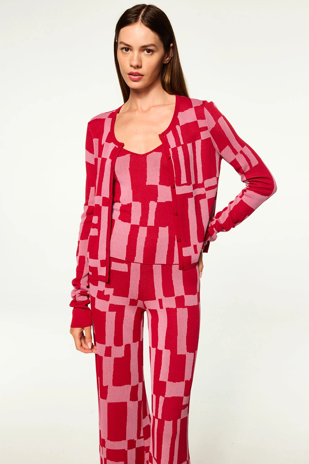 Elvin is a chic stretch knit cardigan in a two-tone red and pink geometric pattern. Featuring a round neckline, long sleeves and red enamel summarys. Pair with the coordinating Koa pant for a bold set. Wear alone or on top of the coordinating Una camisole.