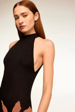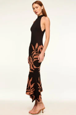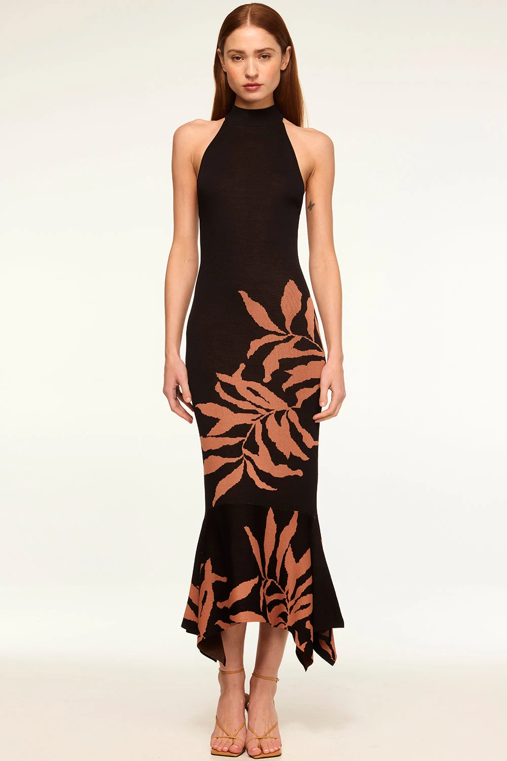 Our figure-hugging knit Ember midi dress features a botanical fern motif and halter neckline. This sleeveless silhouette is pullover style with a modern handkerchief hem. The perfect dress for any occasion on your social calendar.
