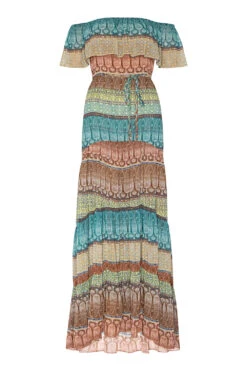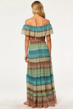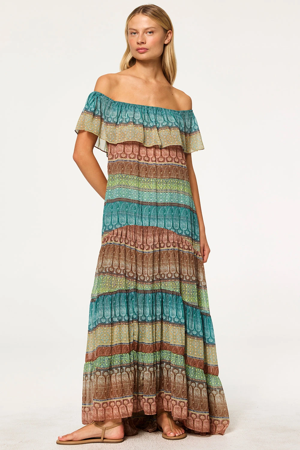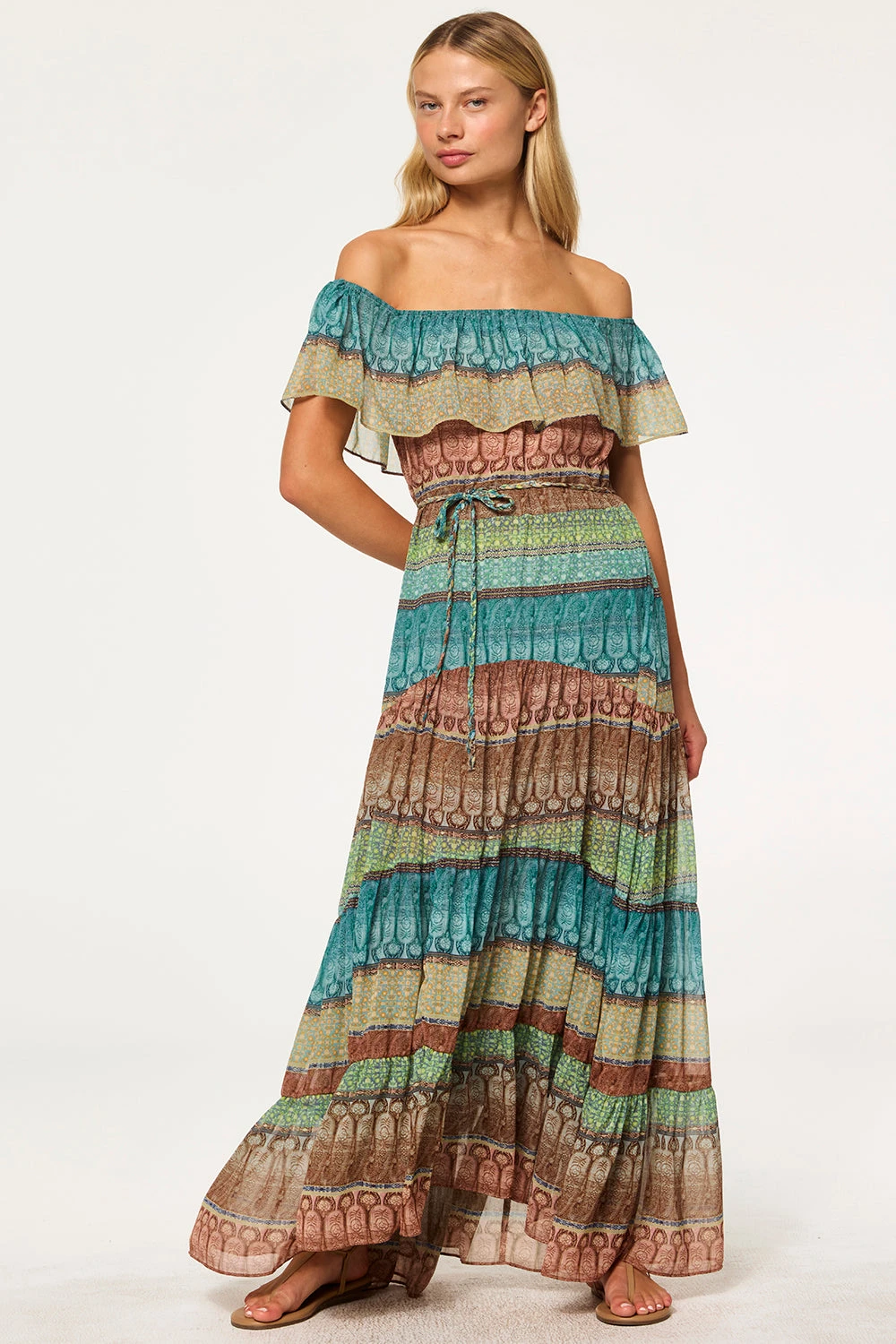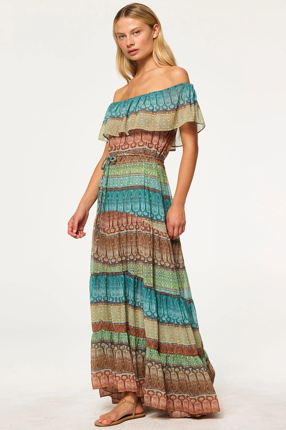 Be the best-dressed guest in the stunning Estella dress, a romantic off-the-shoulder maxi cut from our eye-catching Paisley Ombré print. This short-sleeved silhouette features a ruffle-trimmed neckline and an optional braided self-tie waist for added shape. A tiered, voluminous skirt adds sweeping movement to this feminine style—perfect for weddings, garden parties, and every special occasion.