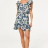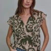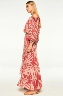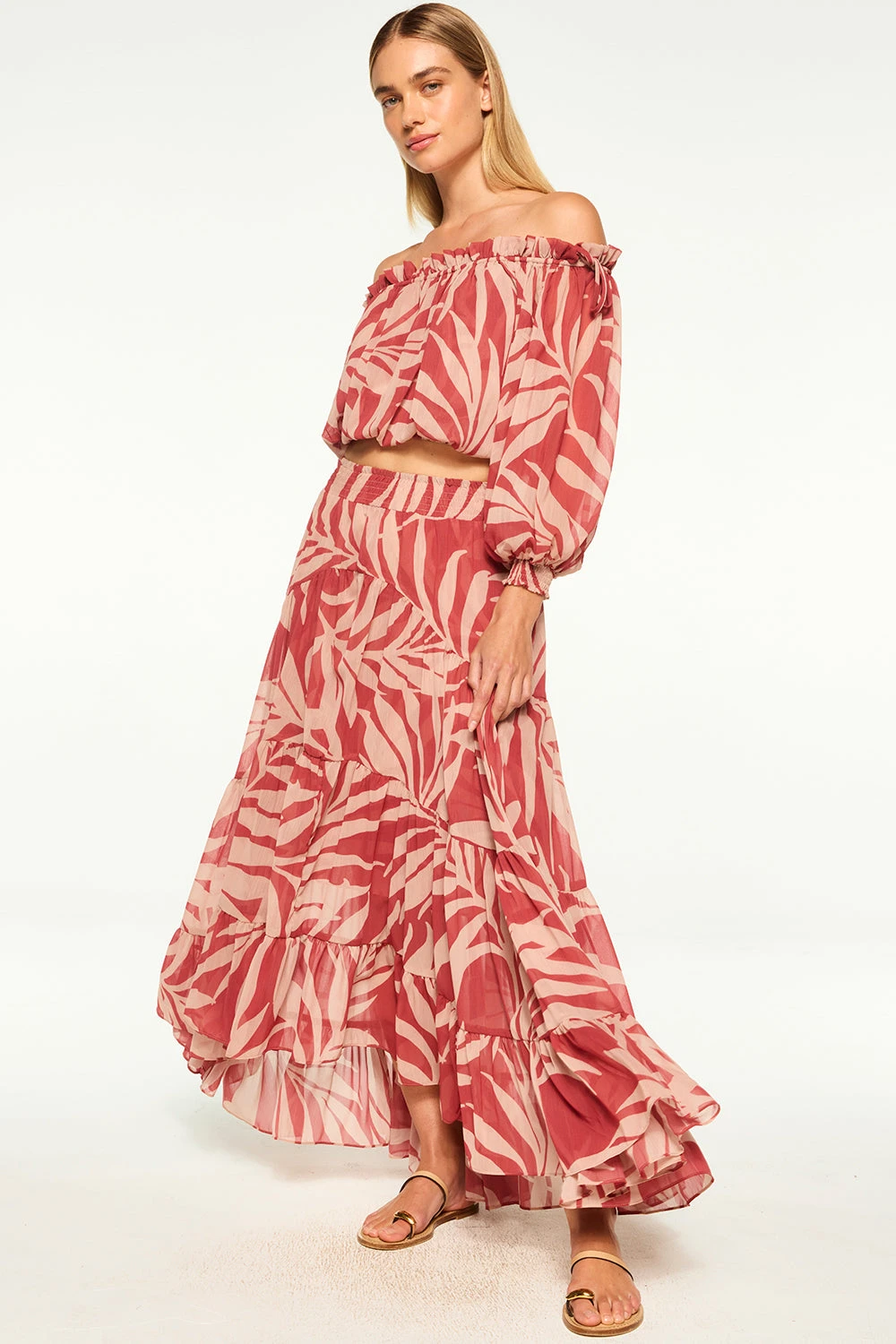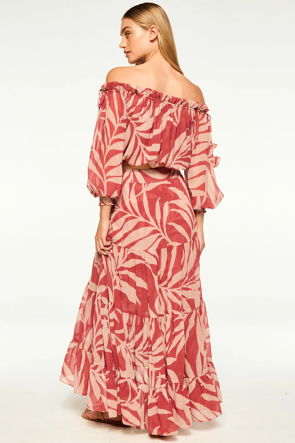 Our newest Eva top is a flirty off-the-shoulder crop top cut from a Palm Frond printed chiffon. An elastic neckline with petal tie detail allows this top to be adjusted for a comfortable fit. Pair this bohemian silhouette with your favorite jeans or complete the look with the coordinating Marie skirt.